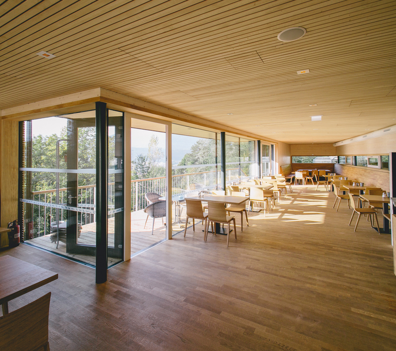 Der weite Blick über das Biber- und Bärengehege in Richtung Nockspitz Serles, usw. wird zum Teil des Innenraumes. Otter und Iltis können mit etwas Glück beim Cappuccino beobachtet werden.
