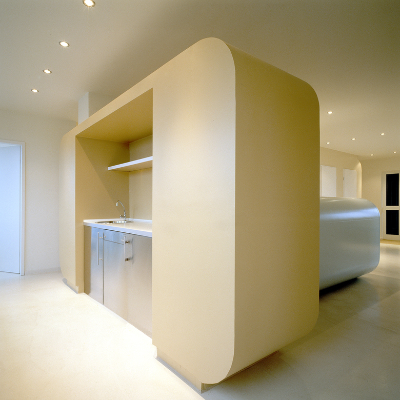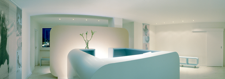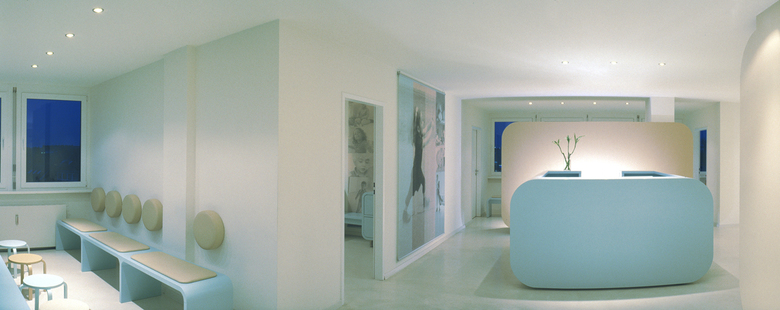 Nach amerikanischem und englischem Vorbild wurde die erste ambulante Kinderchirugische Praxisklinik in Düsseldorf realisiert. Das individuelle innenarchitektonische Konzept besteht aus einer Komposition handschmeichlerischer Formen, sanfter Farben und fließender Räume, in denen die Möbel kleine Inseln bilden. Helle, gebrochene Farben erzeugen eine freundliche, harmonische Atmosphäre: Die Fußböden sind sandsteinfarben, die Wände eierschalenfarben gestrichen, das freistehende Küchenwandelement leuchtet moccafarben und das Mobiliar ist seidenmatt hellblau lackiert. Foyer, Rezeption, Wartebereich und Küche gehen fließend ineinander über und sind inselartig mit Mobiliar bestückt. Zur Großzügigkeit des Raumes trägt nicht zuletzt der fugenlose Fließestrich bei, der alle Räume – bis auf den OP-Bereich und WC-Kubus miteinander verbindet. Bezeichnend für alle Möbel sind die sanft gerundeten Formen, die an Riesenbonbons, Marshmallows und Bausteine erinnern. Die pure, minimalistische Formensprache der aus MDF gefertigten Möbel wurde bewusst so gewählt, denn sie soll Ruhe und Ordnung in einer reizüberfluteten Welt schaffen.