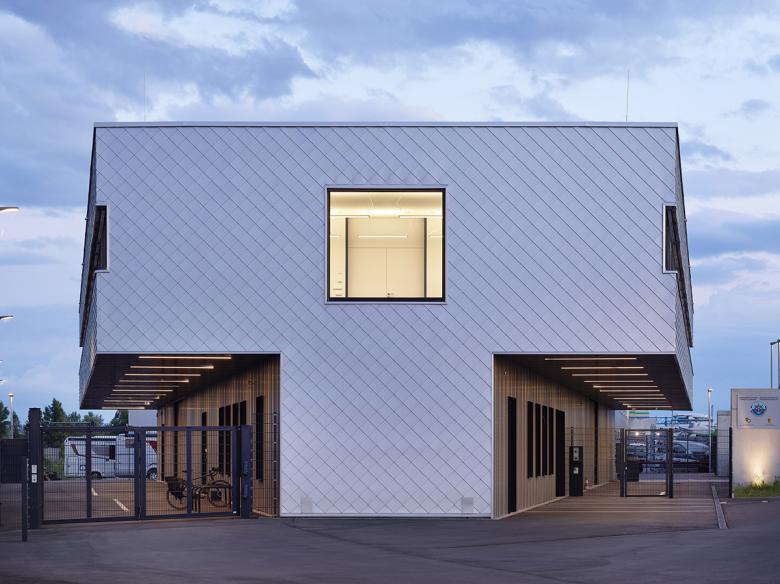 Der Neubau der Deutsch-Französischen Wasserschutzpolizei-Station befindet sich in einer exponierten Lage: Auf der einen Seite das von Brückenkränen umsäumte Hafenbecken, auf der anderen Seite der Rhein. Angesichts dieses Umfeldes wurde der Baukörper in Analogie zu gestapelten Containern ausgebildet, dessen Fassade sich beim Annähern jedoch als fein detaillierte Handwerksarbeit entpuppt. Die das Volumen umspannende Verkleidung aus silbernen Aluminium-Schindeln verleiht dem Gebäude einen chamäleonartigen Charakter: Während es in der Morgensonne rosa leuchtet, wirkt es mittags hell und scharfkantig sowie am Ende des Tages flimmernd. Gleichzeitig zeichnet sich das durch die Schindeln hervorgerufene Schattenraster je nach Sonnenstand in unterschiedlicher Stärke ab.
