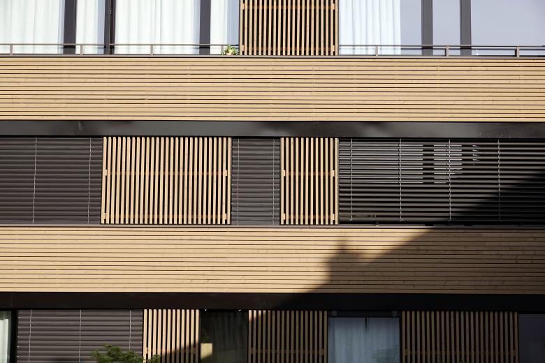 Das Projekt besteht aus drei Wohnungen auf drei Geschossen. Die nach oben abnehmenden Wohnflächen ermöglichen grosszügige Aussenräume für alle Wohnungen. In der Fassadengestaltung wird diese Schichtung und Rückversetzung durch die horizontalen Brüstungsbänder betont. Die markant, über die gesamte Gebäudehöhe verlaufende Betonwand verweist auf das verbindende Treppenhaus und bildet gleichzeitig Anker und Ausgangspunkt für die Brüstungsbänder.
