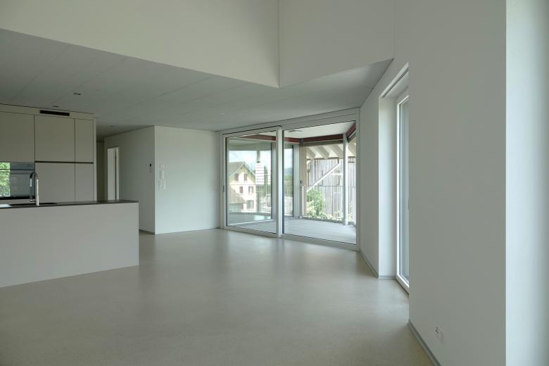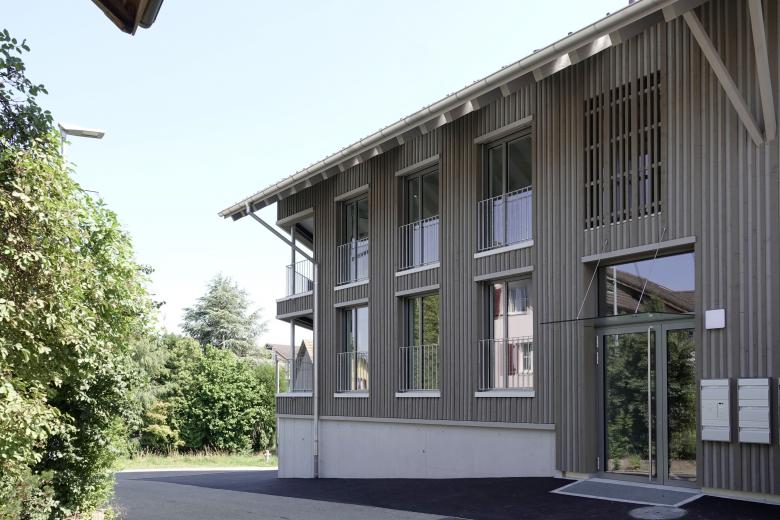 Ziel des Entwurfes war es, auf dem alten Fussabdruck einer ehemaligen Zimmerei ein Mehrfamilienhaus mit 6 Kleinwohnungen zu organisieren. Dafür wurde die alte Ebene des Bodens belassen und beherbergt nun die Einstellhalle. Dadurch sind die Wohnung hochparterre gelegen und erfahren so die nötige Privatsphäre. Die Wohnungen liegen um einen zentralen Erschliessungskern. Dieser wurde so positioniert, dass auch das bestehende Wohnhaus durch einen rückwärtigen Eingang eingebunden werden konnte. Die Fassade, mit einer vertikalen Deckleistenschalung versehen nimmt Bezug auf das, was schon immer an diesem Ort zu finden war. Ein Gebäude in Holz gekleidet.