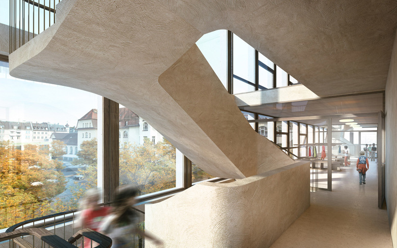 Das neue kompakte Betreuungsgebäude zeigt mit seiner Stellung grossen Respekt vor dem Städtebau und der Architektur der Doppelschulhausanlage des Architekten Gustav Gull. Die Gebäudefluchten der beiden bestehenden Schulhäuser wie auch die beiden Vorplätze der südlichen Kopfbauten werden freigespielt. Die Ansichten der imposanten Schulbauten sind deshalb von keiner Seite verstellt und bleiben auch in der räumlichen Wahrnehmung unangetastet.