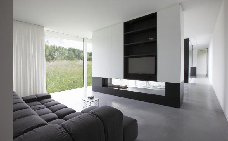 Boven het kelderniveau veruitwendigt een glazen schijf de ligging van de leefruimtes. De transparantie accentueert de voorgevel en biedt tegelijkertijd een panoramisch uitzicht over het groene Tervuurse landschap. Een doordachte overkraging in de volledige zuidgevel voorkomt oververhitting in de zomer, maar verzekert passieve zonnewarmte in de winter.