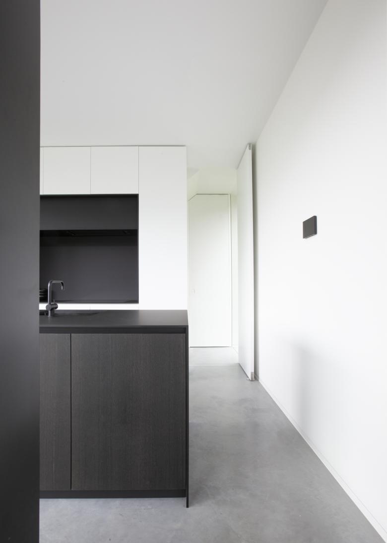 De verticale circulatie en bergruimte vormen een fysieke en akoestische buffer tussen de kantoorruimte en de leefruimtes op de gelijkvloerse verdieping. De leefruimtes laten zich door hun openheid als één geheel beleven, toch zijn de individuele ruimtes duidelijk gedefinieerd. Een patio scheidt de keuken van de eetruimte en zorgt voor een aantrekkelijke lichtgloed op de muren. Dankzij de positie in het grondplan is er vanuit de keuken visueel contact met de straat mogelijk. De relatie met de patio is een surplus voor de eetruimte. De grote schuiframen laten toe te eten of gasten te ontvangen in een binnen-buitenomgeving, waardoor net wel of geen contact met de straat mogelijk is.