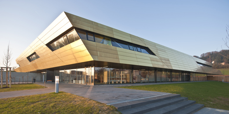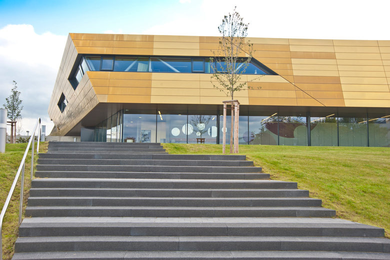 Das Schul- und Freizeitbad greift die topografischen Besonderheiten des Ortes auf und spiegelt diese in der Architektur des Gebäudes wider. Mit seiner kompakten, dynamischen Bauform integriert sich das Bad behutsam in die Umgebung und korrespondiert durch großflächige Verglasungen mit der umgebenden Landschaft. Der transparente Charakter des Freizeitbades bewirkt einen fließenden Übergang von Innen- und Außenraum – die goldene Außenfassade bezieht sich dabei auf die Bezeichnung der Grundstücksmarkierung „Am Sand“. In der Halle ist die kompakte und dynamische Gebäudeform ebenfalls erlebbar. Weiträumig gestaltet, kann der Besucher die unterschiedlichen Funktionsbereiche gut überschauen und sich leicht orientieren. Die einzelnen Becken sind einfach und klar geformt und entsprechend ihrer Funktion angeordnet.