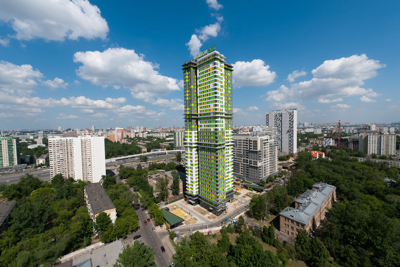 Mit einer Höhe von rund 140 Metern überragt das schlanke Wohngebäude die umgebende Bebauung um etwa das Doppelte und ist damit weithin sichtbar. Die markante Fassadengestaltung mit hohem Wiedererkennungswert bewirkt eine starke Präsenz im Moskauer Stadtbild. Für diese unverkennbare Optik wurde das Gebäude horizontal mittig unterteilt. Die geschlossenen Fassadenbereiche sind im unteren und oberen Teil wechselseitig hellgrau und anthrazitfarben gestaltet. Zudem wird das Gebäude von langen, waagrechten Bandelementen gegliedert. Die heitere Farbgebung sowie die wechselnde Anordnung der Elemente in den einzelnen Etagen lässt ein bewegtes, aufgelockertes Fassadenbild entstehen, das einzigartig im Moskauer Stadtbild ist. Eine Besonderheit des Grundrissentwurfs ist die dreiseitige natürliche Belichtung der Wohnungen, um eine hohe Aufenthaltsqualität zu schaffen.