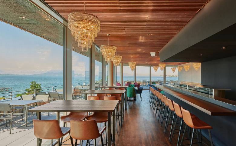 Neubau eines Sport- und Familienbades mit Thermen- und Saunalandschaft am See: Sanft in die Landschaft mit altem Baumbestand eingebettet liegt die Therme Lindau direkt am Bodenseeufer. Die Architektursprache leitet sich aus dem umgebenden Naturraum ab: Felsplatten, Steine und Vegetation prägen den Entwurf, der sich wie eine Landschaft erkunden lässt. Von außen klar und ruhig gestaltet, ist der Baukörper im Innenraum von vielfältigen Raumszenarien mit unterschiedlichen Funktionen geprägt. Das langgestreckte und horizontal geschichtete Thermengebäude ist formal an der Uferkante ausgerichtet und liegt wie eine Steinscholle zurückhaltend im Grünen. Im Erdgeschoss ist die Therme ähnlich einer Landschaft ausgebildet, die von einzelnen Felsblöcken durchbrochen wird. In diesen Blöcken befinden sich die unterschiedlichen Erlebnisbereiche und laden zum Erkunden ein. Darüber liegt die zweite Ebene, geschichtet wie eine Steinscholle am See, sanft in die Landschaft zwischen Eichwald und Bodensee eingebettet. Thematisch umfasst die Therme Lindau drei unterschiedliche Bereiche: Ein Familien- und Sportbad, einen Thermen- und Wellnessbereich sowie eine großzügige Saunalandschaft mit insgesamt zehn Saunen im Innen- und Außenraum. Hinzu kommen gastronomische Einrichtungen und ein Fitnessbereich. Nach Süden öffnet sich die Therme zum Seeufer und bietet eine fantastische Aussicht auf den Bodensee und die Bergwelt. Eingangsbereich und Umkleidetrakt bilden das Rückgrat nach Norden. Die Badeebene im Innenraum ist ähnlich einer Landschaft gestaltet: Die Becken und Wellnessbereiche sind teils in expressiv geformten Volumen untergebracht. Sie gliedern das Erdgeschoss und bilden spannende Raumszenarien. Lufträume verbinden die Ebenen miteinander, bilden Blickbezüge, weiten das Gebäude nach oben und lassen Tageslicht ins Gebäude fallen. Von allen Seiten ist der Bezug zum Außenraum spürbar und das wechselvolle Spiel von Licht und Schatten verleiht den Räumen eine emotionale Wirkung.