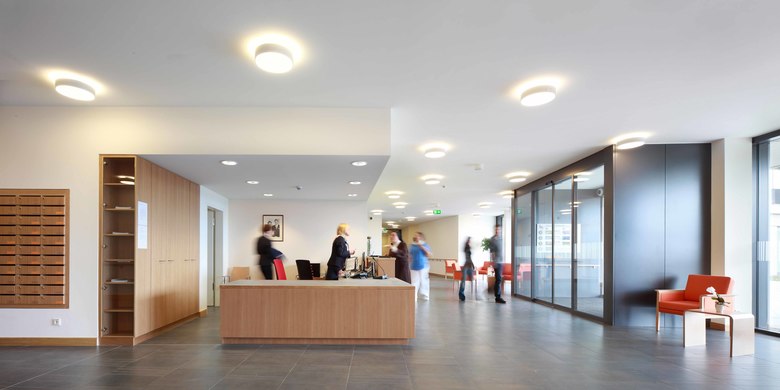 Räumliche Vielfalt und das Farb- und Materialkonzept schaffen eine identitätsstiftende und wohnliche Atmosphäre. Als Stimmungsträger dienen die Werkstoffe Holz, Betonwerkstein und Textilien, welche in warmen und erdigen Farbtönen gehalten sind.
