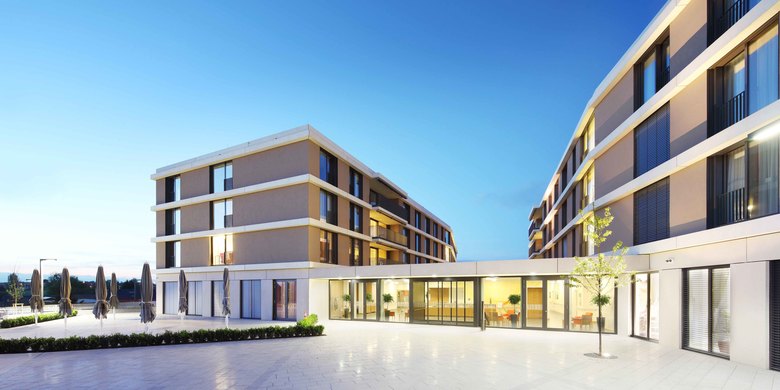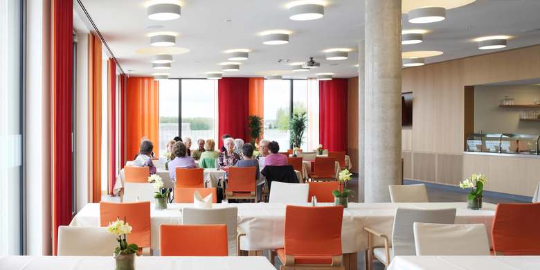 Der Baukörper ruht als Solitär zentral auf dem weitläufigen Grundstück. Er ist in die nach Nordwesten abfallende Hanglage eingeschoben. Die volumetrische Gliederung des Baukörpers in Sockel und Obergeschosse, die Aufteilung der Pflegegeschosse in zwei Häuser sowie die polygonale Konturierung des Gebäudes lassen das Wohnheim nicht nur optisch kleiner erscheinen, sondern optimieren die interne Orientierung und die funktionalen Abläufe. Die beiden dreigeschossigen Baukörper mit den Bewohnerzimmern lagern auf dem Sockel mit den halböffentlichen Nutzungen. Der großzügige, piazzaartige Vorplatz lädt zum Verweilen ein und wird insbesondere durch die angelagerte Brasserie mit Terrasse belebt.