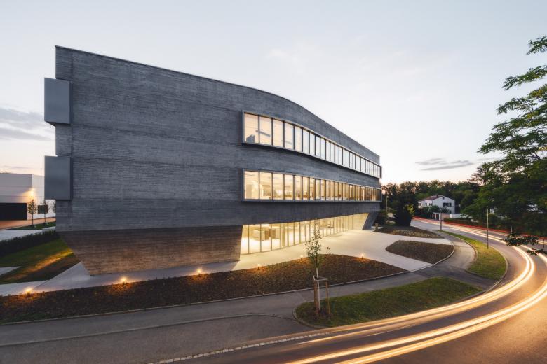 Der skulpturale Baukörper besteht aus einer Sichtbetonkonstruktion aus Dämmbeton. Unterschiedliche Oberflächentexturen aus Bretterschalungen und reliefartigen Strukturen der Kerne im Erdgeschoss verleihen dem Gebäude eine handwerkliche Anmutung.