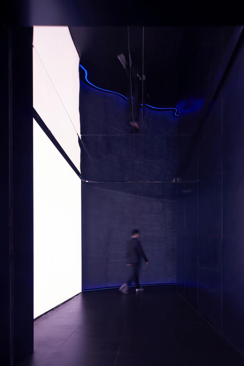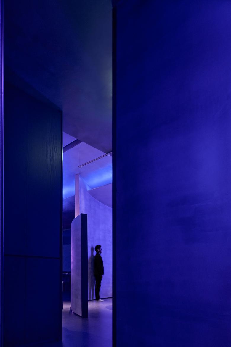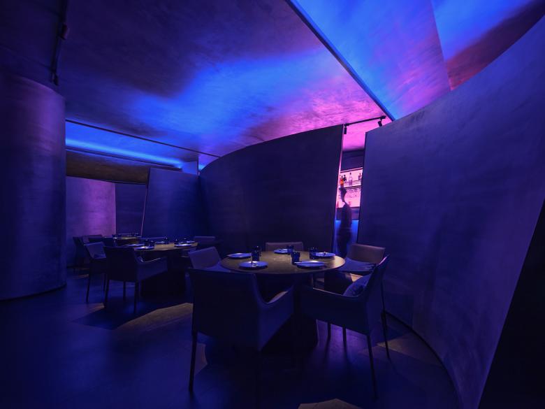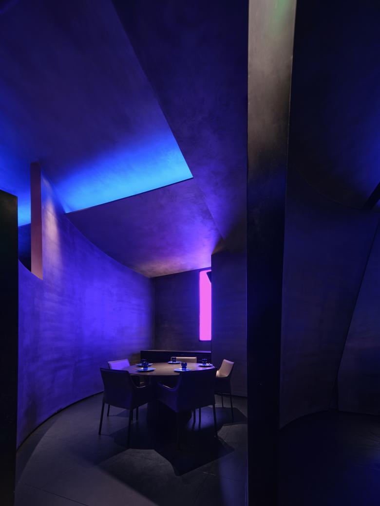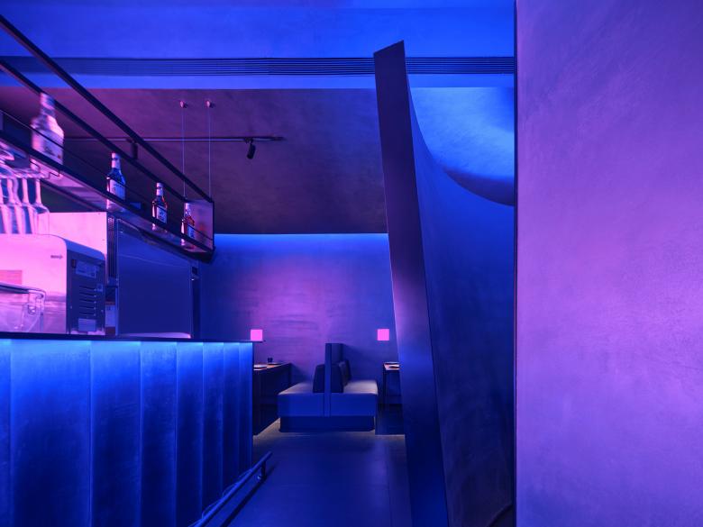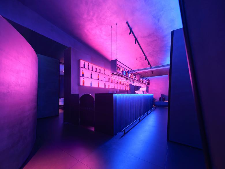 Cool blue lights are hidden among irregular blocks, bringing a breathing and vague ambience to the space. The pink neon light in the bar counter area forms a strong contrast with the blue light, generating an illusionary experiential scenario as well as a free, magical and radical artistic atmosphere.