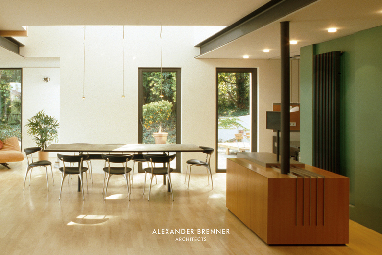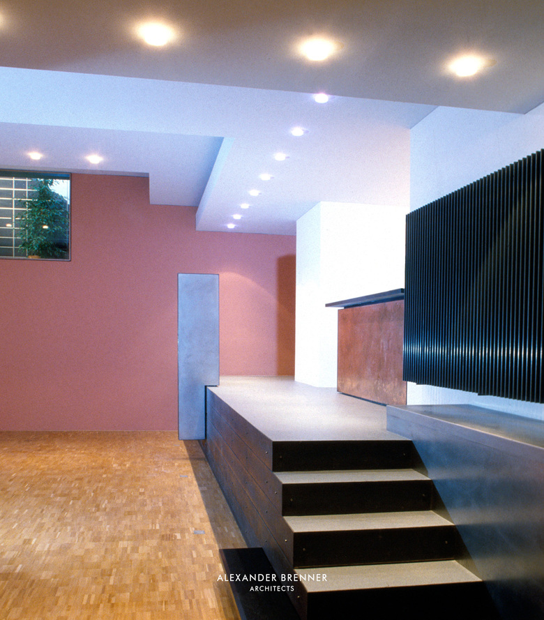 Das Haus liegt auf dem Höhenrücken der Wernhalde, in einem Gebiet mit der für Stuttgarter Hanglagen typischen freistehenden Einzelbebauung. Das Gelände erhebt sich 3 Meter über der Erschließungsstraße und ist Teil eines ehemaligen Villengrundstückes. Aus der Zeit der Jahrhundertwende stammt das oberhalb der Garage an der Straße liegende Teehaus. Von hier aus steigt der Weg, um das Haus herumführend, zum Eingang an der Rückseite an. Auf der Südwestseite wird durch den alten Baumbestand und eine neu erstellte, gebogene Wandscheibe ein hofartiger Außenraum geschaffen, der sich zum gegenüberliegenden Waldrand öffnet. Diesem „Gegenüber“ wendet sich auch der große Raum im Erdgeschoss des Hauses zu. Er besteht aus verschiedenen Raumzonen, die ineinander fließen. Die einzelnen Bereiche sind bestimmt durch den Wechsel von hell und dunkel, hoch und niedrig sowie schmal und breit. Es entsteht ein Raumkontinuum mit unterschiedlichen Raumdichten. Das Erdgeschoss wurde über ein großes „Fenster“ mit dem 6 Meter tiefer liegenden „Freiraum“ unter der Erde verbunden. Dieser „Freiraum“ ermöglicht verschiedene Nutzungen mit wechselnden Inhalten. Er wird sowohl für die beruflichen Zwecke, wie Vorträge und Seminare wie auch als Raum für die klassischen Rennwagen, einer Passion des Bauherrn, genutzt.