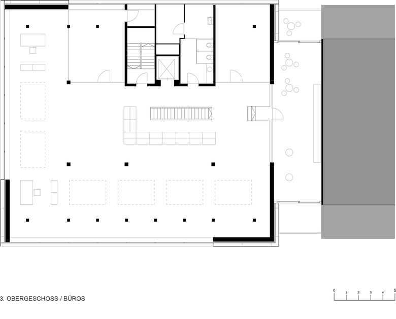 Die Fassade ist als klassisch hinterlüftete Konstruktion ausgebildet, wobei sowohl Wetterschutz als auch Dämmung aus transluziden Kunststoffmaterialien bestehen. Die innere Schicht wurde mit Scobathermplatten ausgeführt, der äussere Wetterschutz mit Scobalitplatten. Diese Materialwahl verleiht dem Gebäude einen hautartigen, durchscheinenden Charakter und ermöglicht ein intensives Wechselspiel zwischen Innen und Aussen sowie zwischen Licht und Raum. Inspiriert von lichtdurchfluteten Körpern wie Medusen oder Schneeiglus entstand eine Architektur, die weniger Form als vielmehr den Ausdruck des Lichts thematisiert. Die einfache Materialisierung und die klare kubische Erscheinung prägen den Baukörper nach aussen und vermitteln eine anspruchsvolle Zurückhaltung. Durch eine subtile Drehbewegung der oberen Fassadenpartien wird die Orientierung zum Hof geregelt, während die gegenläufige Ausbildung der unteren Partien den Besucher gezielt zum Eingang führt. Die öffentlich zugänglichen Bereiche im Erd- und Obergeschoss umfassen Showroom, Empfang, Ausstellung, Auditorium und Café. In den oberen Geschossen sind Büroräume, Prototypenraum, Kantine, Bibliothek und Sitzungsräume für die Mitarbeitenden angeordnet.