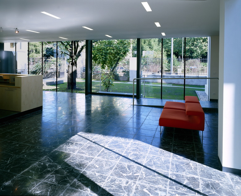 Zwei bestehende Gebäude wurden auf einem Grundstück mit schönem altem Baumbestand zusammengefasst und um ein Foyer und eine Kapelle erweitert. Der niedrige Verbindungsbau – klar, reduziert und transparent – enthält ein großzügiges Foyer. Er vermittelt zwischen den behutsam sanierten Altbauten und der Kapelle, deren Fenster mit beweglichen Lamellen eine ganz besondere Lichtstimmung schaffen.