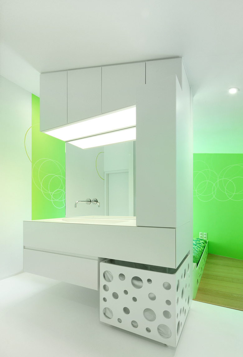 The interior provides a multifunctional use of the available space possible. Sleeping, storing, washing and dressing become a continuous experience. The open bathroom space is also a circulation space to access the bedroom and the dressing room. The glass door that defines the dressing room is also the door of the shower. A raised floor next to the bed is designed as storage space. The central furniture element is divided in a bright daypart at the bathroom side and a warmer night part at the bedroom side. The element provides the required storage space for both spaces. In the sleeping area, circles on the wall are positioned according to the sleep curve. They end in the space of the daypart. Cut out circles in the side of the bed, in the roll able laundry box and in front of the radiators, ensure the necessary air circulation and ventilation. The use of the same round openings in the dressing creates different storage options.