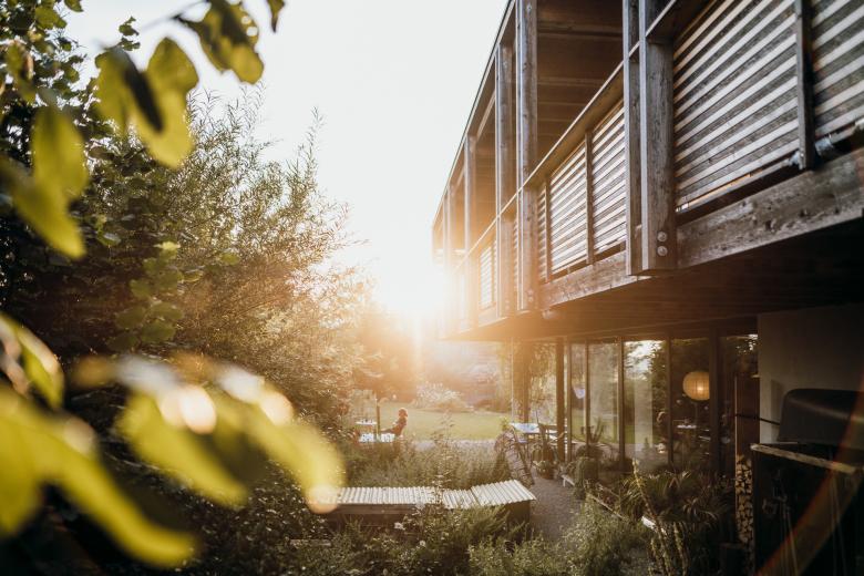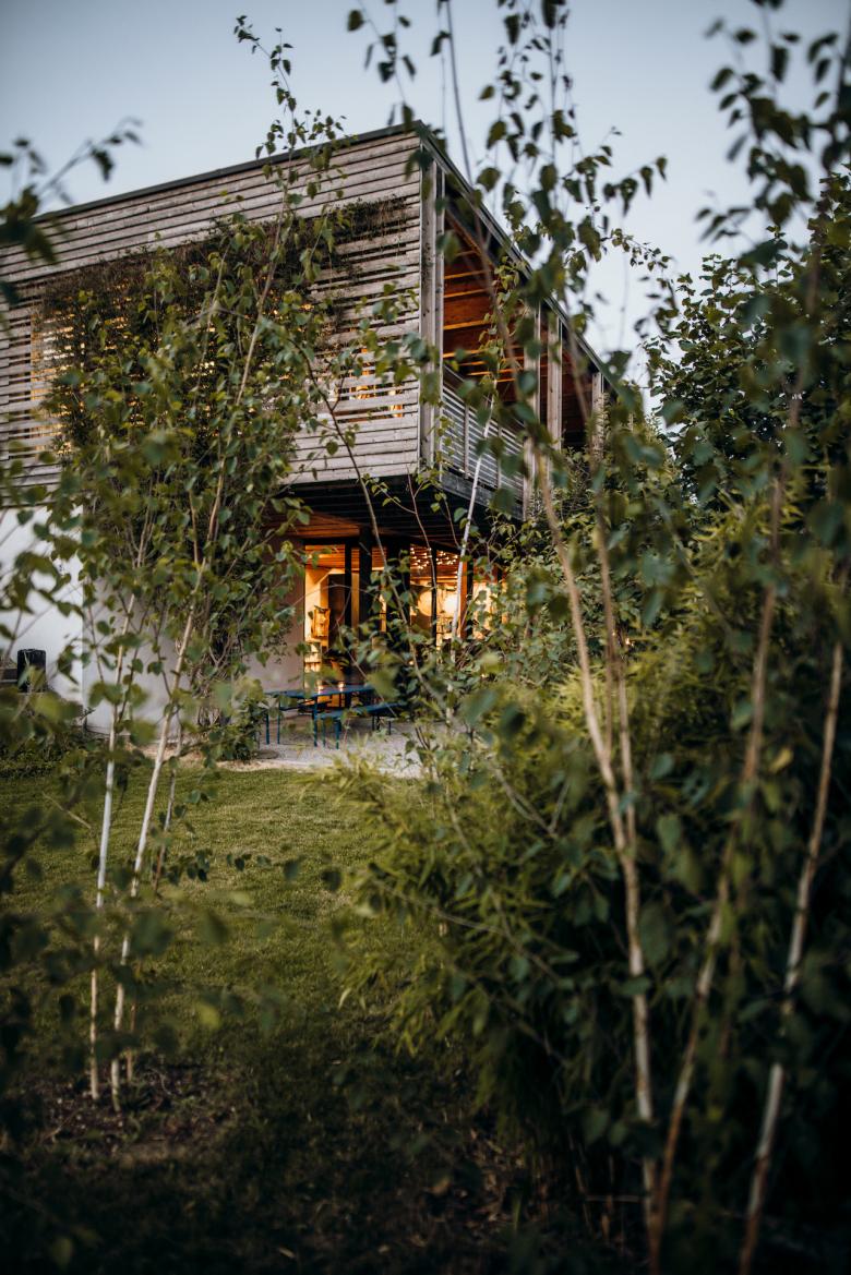 Schnörkellos, funktionell, grosszügig, wohl proportioniert. Klare, geschossweise Trennung von Wohn- und Atelierbereich. Mit 21 m Gebäudelänge konnte ein stattliches Volumen in energie- und kosteneffizienter Bauweise erstellt werden. Anstelle von kostenintensiven Oberflächen wurde in die Volumetrie und in die hochwertige Gebäudehülle investiert. Kräftige Farbakzente im Innenraum (ultramarinblau, hellolive, magenta) und eine natürliche Materialisierung und Farbgebung der Aussenhülle integrieren das Gebäude unaufdringlich in den Grünraum. Die Hecke im Gartenbereich grenzt den Aussenraum ein und ermöglicht vom Atelier den Blick in üppiges Grün und vom Wohngeschoss in die weite Ferne.