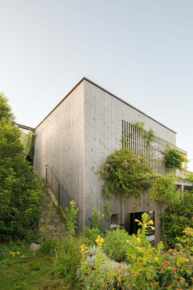 Dicht an den Hang schmiegt sich ein kleines, interessantes Einfamilienhaus. Ausgeklügelt organisiert lebt es sich hier hervorragend auf nur einer Etage, oben und unten – Natur! Im Untergeschoss zwischen den Fundamenten kann geparkt werden, das grüne Dach wird mit Garten und Hochsitz zur Wohnraumerweiterung – und hält durch die dicke Erd- und Pflanzenschicht das Volumen angenehm temperiert!
