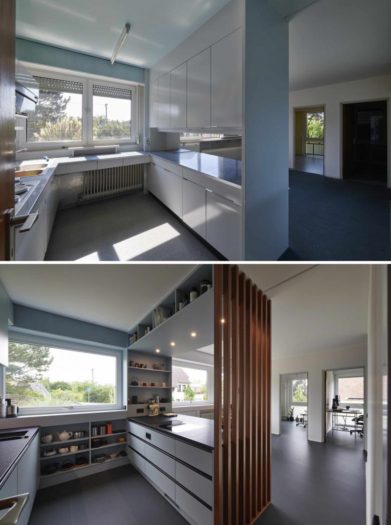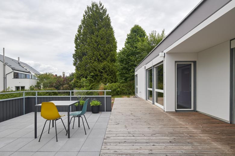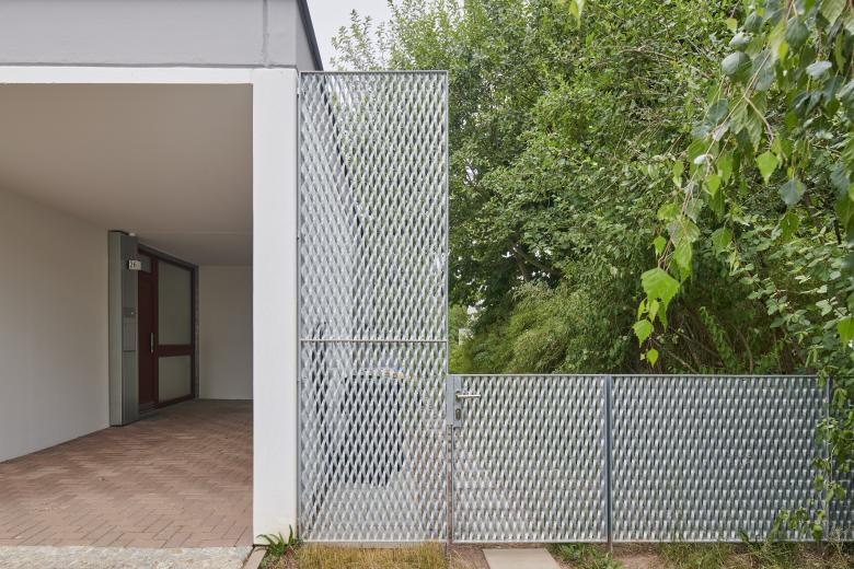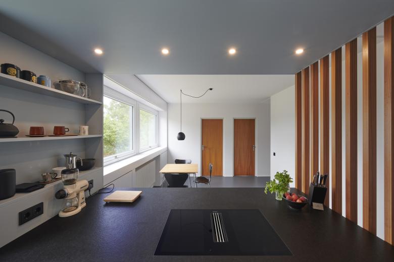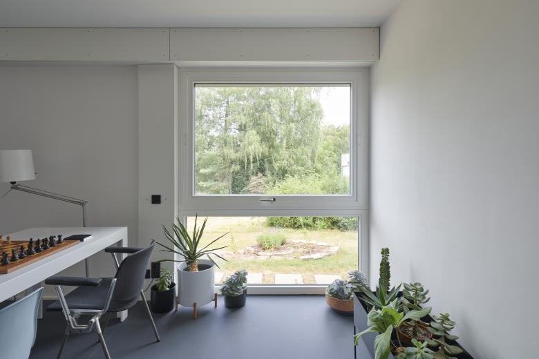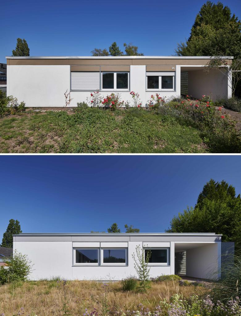 Die Herausforderung bestand darin, das Haus aus dem Jahr 1965 mit 120 m2 Wohnfläche energetisch zu sanieren und zeitgemäß zu modernisieren, ohne den besonderen Charakter der Architektur, der sich durch die Ablesbarkeit der Konstruktion auszeichnet, zu beschädigen. Eine Außendämmung, die die feine Gliederung und Fugenteilung der Fassade zerstört hätte, kam daher nicht in Frage. Die Plattenbauweise sollte sichtbar, die Geschichte des Bauwerks erhalten bleiben. Um zeitgemäße und nachhaltige Wohnvorstellungen zu erreichen, wurden stattdessen bauliche Verbesserungen wie eine Flachdachdämmung, neue Fenster mit Dreifachverglasung und eine Innendämmung an kritischen Stellen mit optimierter Anlagentechnik aus Luftwärmepumpe, für Niedrigtemperatur ausgelegte Heizkörper sowie einer PV-Anlage auf dem Dach kombiniert.