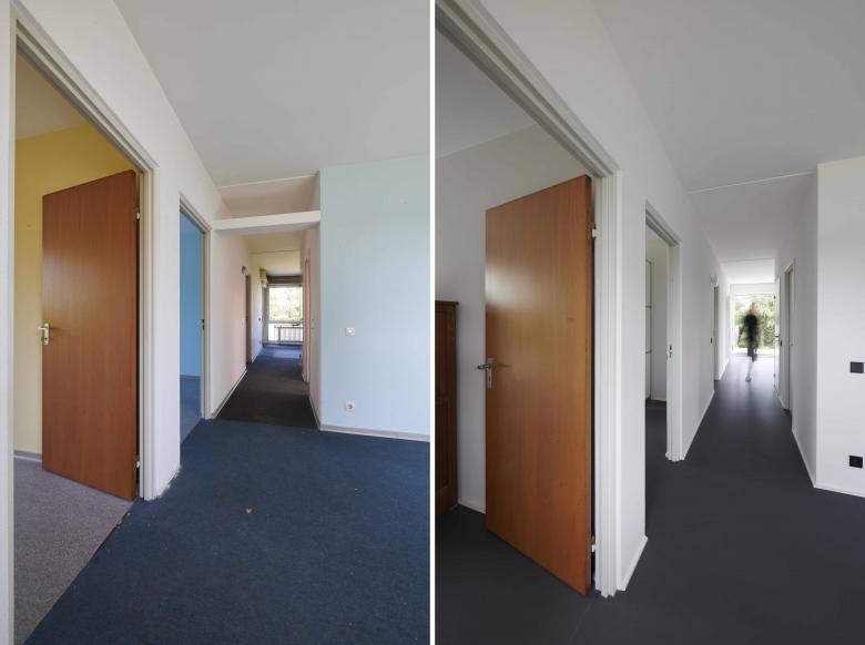 Obwohl kein Baudenkmal, wurde die Sanierung im Sinne einer erhaltenswerten Bausubstanz durchgeführt. Die zeittypischen Schwingfenster, die verlorengegangen waren, konnten in neuster Bauweise wiederhergestellt werden. Markante Merkmale der Fassade, wie die Fensterleibungen aus feuerverzinktem Stahl mit integrierten, gestalterisch hervorgehoben Rolladenblenden aus Faserzement wurden herausgearbeitet. Um die horizontale Gliederung des Baukörpers durch das prägende Attikaband nicht zu beeinträchtigen, wurde die, durch die neue Dachdämmung unvermeidliche Attikaerhöhung zweistufig ausgeführt. Zusätzlich wurde eine extensive Begrünung angelegt. Qualitätsvolle Innenraumdetails, wie die bauzeitlichen Türen und Wandverkleidungen aus Teakholz wurden aufgefrischt. Bad- und Kücheneinrichtungen, die aus technischen und nutzungsspezifischen Gründen komplett erneuert werden mussten, fügen sich selbstverständlich in das ursprüngliche innenarchitektonische Konzept ein.