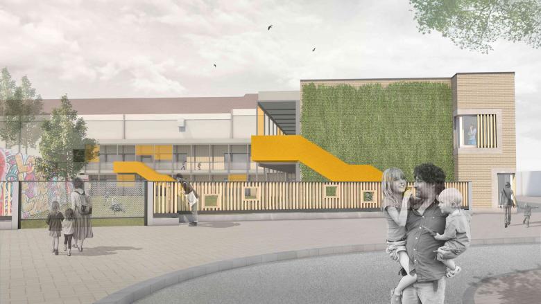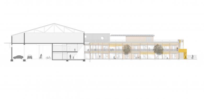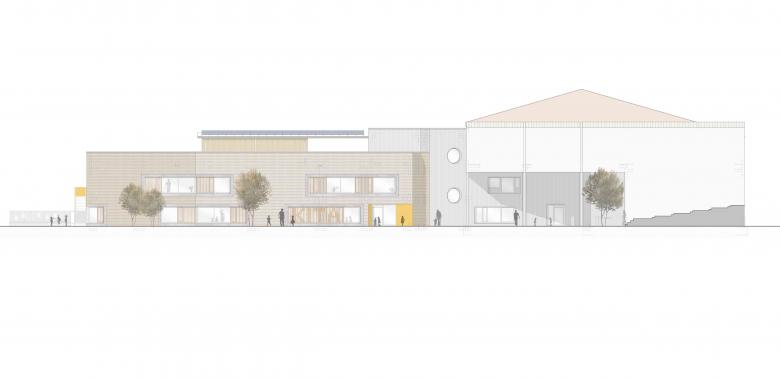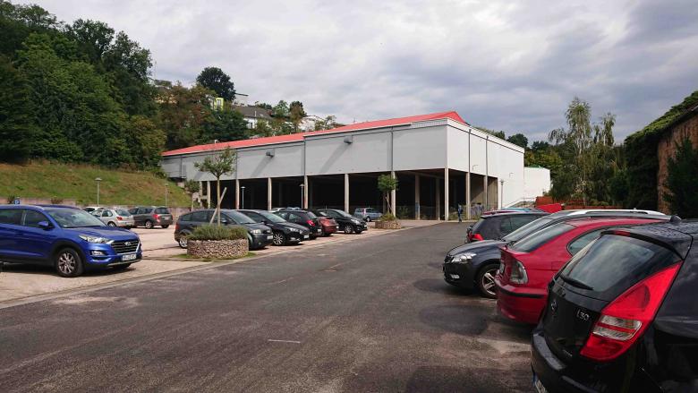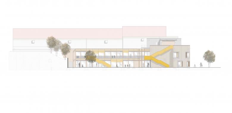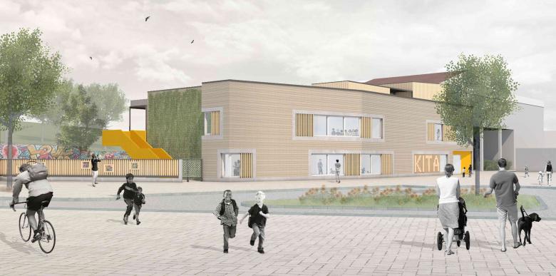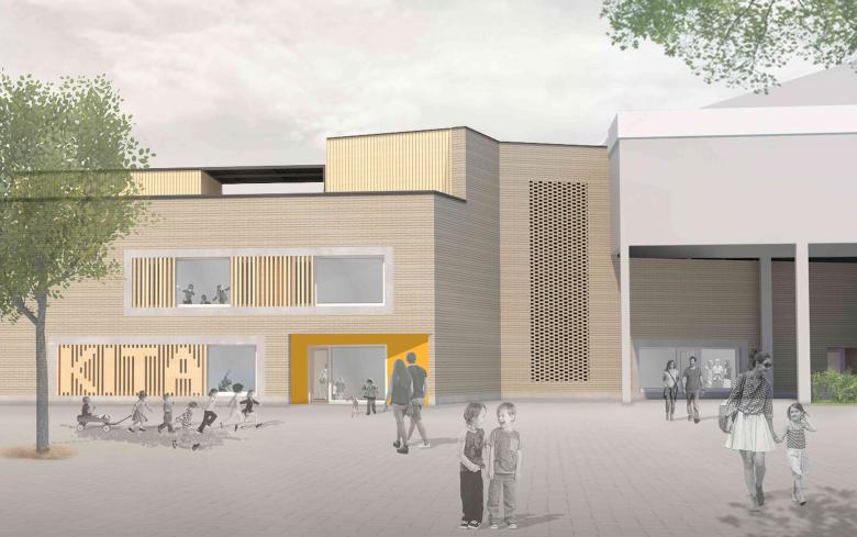 Der dritte Anlauf muss klappen: nachdem unser erstes Projekt „boxoffice“ aus dem Jahr 2002 und der im Jahr 2009 durchgeführte Wettbewerb des Dorfgemeinschaftshauses (Sieger: dreibund architekten) unrealisiert blieben, hat die Gemeinde Spiesen-Elversberg die Gunst der Stunde genutzt, die Standortentscheidung des Neubauprojektes eines Kindergartens von der Pfarrkirche St.Ludwig infolge von Grundstücksschwierigkeiten zum Festplatz unterhalb des „Edeka“-Marktes abzuändern, um endlich die städtebaulichen Probleme in diesem Bereich zu lösen. Dabei haben wir das unglaubliche Glück (nach einem gewonnenen VgV-Verfahren) an der Heilung der „offenen Wunde“ im Ortskern von Spiesen mitzuwirken. Unser Entwurf bietet nun eine Chance, die städtebaulichen Defizite, die das aufgeständerte Marktgebäude hinterlassen hat, zu beheben. Der zweigeschossige Neubau ist für 5 Kindergarten- und 3 Krippengruppen mit einer Gesamtfläche von 2.210 qm ausgelegt. Um die Gebäudemasse ortsverträglich zu integrieren, wird ein Teilbereich des Kindergartens in den freien Luftraum unterhalb des bestehenden Einkaufsmarktes hinein geschoben. Auf diese Weise wird ein „verlorener“ Raum nicht nur einer Nutzung zugeführt, auch die Flächenversiegelung wird klimagerecht minimiert. Zugleich bietet der Raum im hinteren Bereich Platz für die Mitarbeiterautos. In anderer Richtung teilt der freistehende Flügel des Kindergartens die übergroße Platzfläche in zwei maßstabsgerechte Bereiche neu. Zwischen dem Kindergarten und dem Hang des Butterbergs entsteht ein geschützter Spielhof, während auf der Ostseite ein öffentlicher Raum für die Erschließung geschaffen wird. Das Gebäude selbst reagiert mit seinen Materialien auf die unterschiedlichen städtebaulichen Situationen: Zum öffentlichen Raum werden die Außenwände des freistehenden Flügels mit einer robusten Verblendung aus Klinkermauerwerk verkleidet. Die zum Spielhof orientierten Fassaden erhalten eine natürliche Holzverkleidung mit einer Laubengangkonstruktion davor, die ebenso aus Holz errichtet wird. Die funktionalen Fassadenflächen der Garagenbereiche werden mit einer vorgehängten Aluminium-Welle verkleidet. Die Dachfläche bietet zusätzlich ein Nutzungs-Angebot für die Kinder in Form eines Dachgartens mit intensiver Begrünung. Eine darüberliegende Plattform, bestückt mit PV-Modulen, dient als Rankhilfe und sorgt zugleich für eine natürliche Verschattung. Zusammen mit dem historischen „Haus Lion“ wird dieses neue Ensemble den sehr heterogenen Ortskern von Spiesen architektonisch und städtebaulich aufwerten.