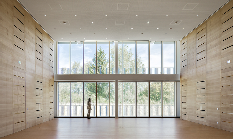 Lagequalitäten Die außerordentliche Lage der neuen Schule, also ihre Nähe zum See und der unverbaute Blick zum Seeufer, führen zu einer Gebäudestruktur die sich Richtung Wasser öffnet und den Raum zwischen See und Sporthalle in die innere Welt der Schule aufnimmt. Die Grenzen zwischen Außen und Innen werden aufl ösbar. Ebenso wird der Erschließungsverkehr integriert. Der Parkplatz wird überbaut und somit als Bauland genutzt. Der Radverkehrsknoten wird in gewisser Weise Teil der Verkehrsstruktur der Schule. Die Außenbereiche der Schule mit ihren Spiel-, Garten- und Arbeitsbereichen sind zum Umfeld geöffnet. Die innere Welt Als Clusterschulen sind die Volks- und Mittelschule so organisiert, dass ein hohes Maß an Flexibilität die Anordnung der Strukturteile bestimmt. Die Geschosse sind Plattformen für unterschiedliche Arbeitsanordnungen, die alle mit dem Außenraum sehr eng verknüpft sind. Die Höfe und die Eingangsbereiche können vielfältig an das Umfeld andocken, die innere Erschließung ist mehr Dorf als Straße, der Cluster gibt Raum für frei organisierbare Zusammenarbeit und die Klassen selbst können ein Ort der Ruhe, des Rückzugs sein. Die Schulen sind „offene“ Orte mit allen Möglichkeiten, mit einem maximalen Angebot für alle existierenden und zukünftigen Unterrichtsformen. Die nicht-öffentlichen Bereiche sind so geordnet, dass den einzelnen Gerichten klare, kompakte Bereiche zugeordnet sind. Energetisch, ökologisches Konzept Die Geschossdecken sind massiv in Stahlbeton mit sämtlichen Leitungsführungen, insbesondere der Lüftung, in der Decke konzipiert damit die nötige Speichermasse zum tragen kommt und gleichzeitig die Niedertemperatur-Bauteilaktivierung zum Temperieren genutzt werden kann. Durch die Stärke von über 35cm kann schalltechnisch auf aufwändige Aufbauten verzichtet werden und somit die Speichermasse nach oben und untern wirken. Zur Schallabsorption werden punktuelle Maßnahmen wie Schallsegel getroffen. Die innere Kompaktheit ist im hohen Maß dem Außenraum geschuldet.