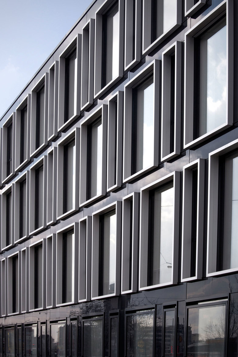 Korrespondierend zur Architektur nimmt die Gestaltung des Platzes Bezug auf die Formensprache des Gebäudes, die sich in der markanten Fassade abbildet. Dem prismatischen Baukörper haben die Architekten des Büros BAURCONSULT ein einheitliches Fassadenkonzept zugrunde gelegt, das auf einer modularen Grundordnung aufbaut. Dieses Grundkonzept erstreckt sich über alle Funktionen und die gesamte Fassadenabwicklung. Das Gebäudeinnere ist von einer zellenartigen Raumstruktur geprägt, die sich ihrerseits an der Außenfassade spiegelt. Jeder „Grundzelle“ sind eine Fensterverglasung und ein schlanker Lüftungsflügel zugeordnet und entsprechen jeweils der Höhe der Räume. Diese Anordnung leitet das Grundthema der Fassadeneinteilung in einem Verhältnis von 2 zu 1 ein.