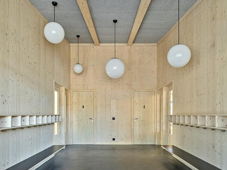 Die Fassaden sind mit Sockelteil, Wandteil und Dachteil dreiteilig strukturiert. Die Fassadenstruktur ergibt einen einheitlichen Auftritt mit einem einprägsamen Gesicht. Die rohen Materialien werden sichtbar und effizient eingesetzt und unterstreichen die Selbstverständlichkeit des Baus. Die feingliedrige vertikale Fassadenstruktur erzeugt eine sinnliche Ausstrahlung und gliedert sich in die natürliche Umgebung ein.