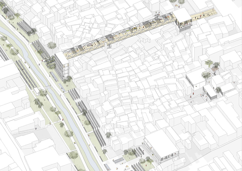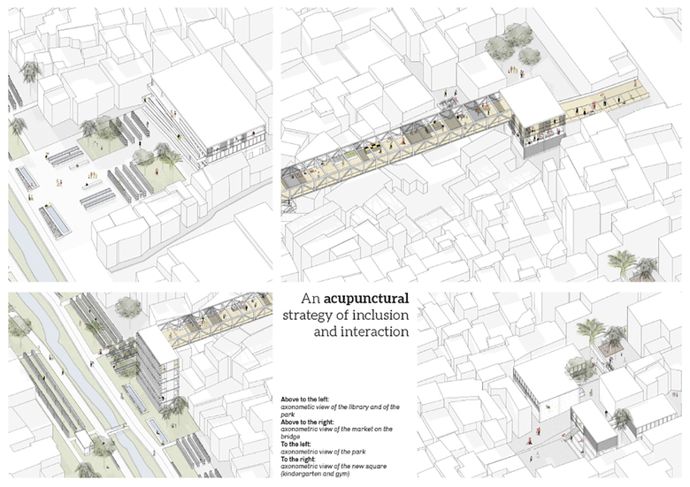 Água Espraiada Urban Operation, part of the Directive Urban Plan of São Paolo since 2001, establishes the construction of a new street that would cause the removal of over 8000 families. The alternative within the project consists in a thin linear park obtained through a minimum removal of most precarious shacks and new services activated in three empty areas at the borders of the settlements that, compensating for the deficiencies of the neighbourhood, can function as a link between these two urban fabrics. The buildings designed for the Vietnã are a market, a library, a kindergarten and a gym, that have a free plan and a modular economic steel structure adaptable to different uses. They are open to the squares where they are built, communicate with them and don’t overload space. Because revitalisation necessarily has to respond to the enormous infrastructural lacks, each of the new buildings hosts toilets and, with its lighting, contributes to the overall illumination. In the park there are gardens realised with over-layered simple vases, whose soil can also be fertilised by the biologic septic tanks that are placed on the park. Maintenance of the park and farming can give a boost to the economy of the settlement creating new jobs. The market is accessible through a building placed on the current main entrance to the community and continues on the connected bridge, the most characterising and controversial part of the project. This bridge could be seen as a way to overlook the taboo that favelas still represent but is instead conceived as a public and multifunctional infrastructure that connects two worlds, stage of junction, commerce and meeting. This method, applied to Vietnã, can be extended to other areas, avoiding removal as much as possible and rehabilitating the now empty spaces. A smart displacement can result in an area with autonomous production of food and for the promotion of new jobs linked to its maintenance and, if implemented on a large scale, this model could have a role in the cycling mobility imaging a green network that connects itself to macro-mobility of public transportations.