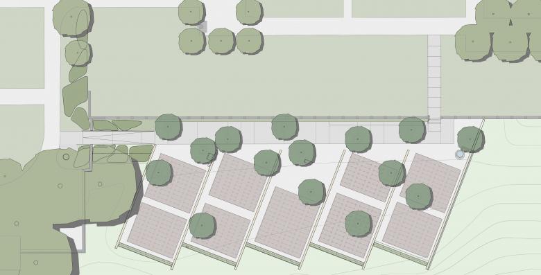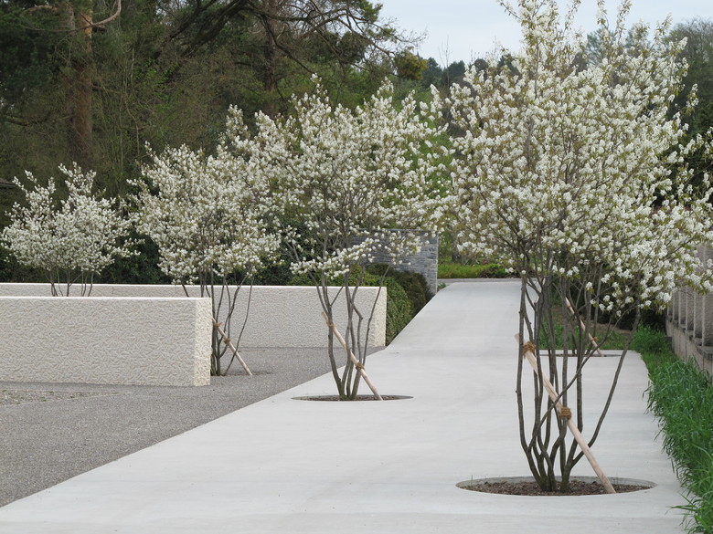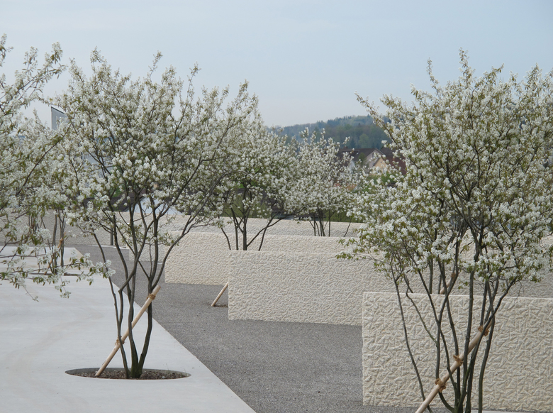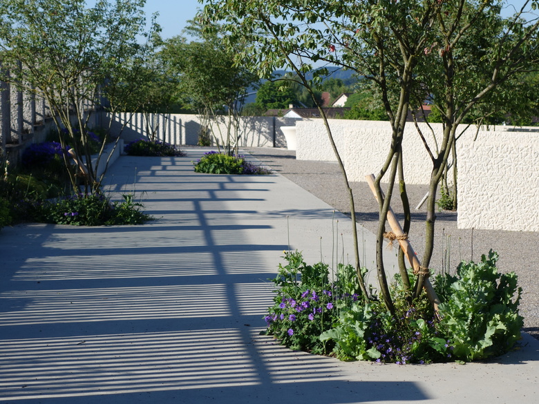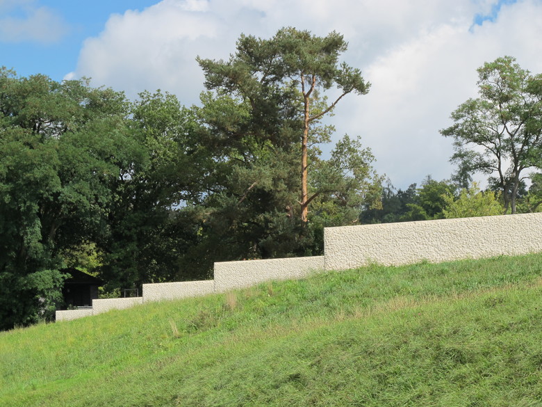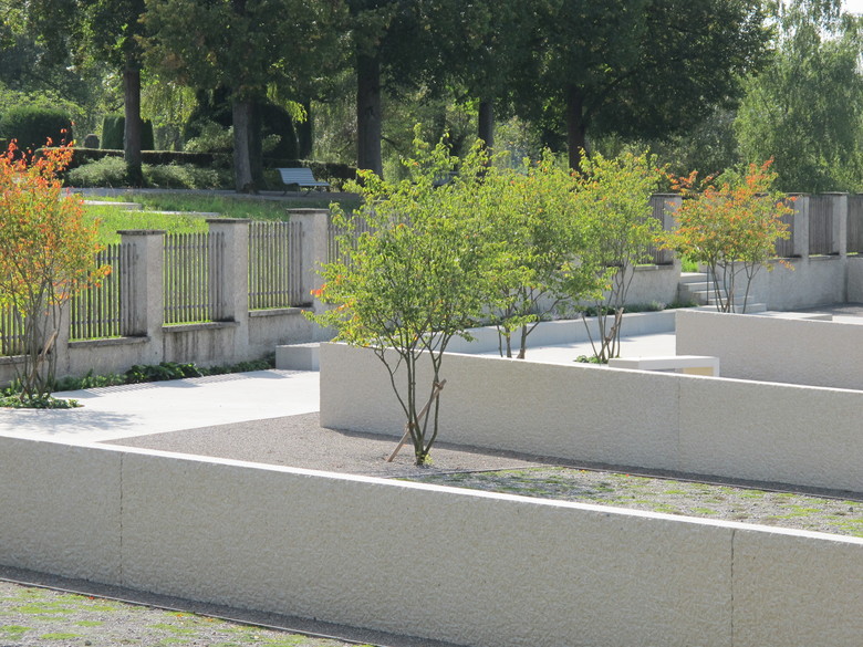 Der Friedhof Rosenberg ist ein Schutzobjekt von kantonaler Bedeutung. Die neue Anlage fügt sich selbstverständlich in die Situation ein und belässt die historische Bausubstanz nahezu unangetastet. Die unmittelbar an den bestehenden Friedhof vorgelagerte Situierung schafft grösstmöglichen Abstand zu den Kleingärten und dem Flurweg. Die Erweiterung verwebt sich mit den angrenzenden Bauetappen und wird zum Bestandteil der Gesamtanlage. Mit wenigen Terrainverschiebungen passt sie sich in die Topographie des leicht abfallenden Hanges ein. Die Flächen können behindertengerecht erreicht werden. Zwei Zugänge führen auf einen breiten, mit kleinkronigen Bäumen durchsetzten Betonweg. Von hier aus können die Grabfelder betreten werden. Sie sind durch 1.20 Meter hohe Mauern aus grob gespitztem Kalksteinbeton gegliedert. Diese Mauern sind nach Mekka ausgerichtet und geben dadurch den Gräbern die Richtung vor. Die Grabstätte wird durch den lockeren Hain mehrstämmiger Felsenbirnen geprägt. Diese Pflanze zeichnet sich durch vielseitige Eigenschaften aus: malerische Wuchsform, dunkle Rinde, weisse Blüten und eine schöne Herbstfärbung. Den Abschluss gegen Westen bilden zwischen die Mauern eingespannte, etwas niedrigere Buchshecken. Die Grabfelder liegen in einem Kiesbelag und sind mit einem changierenden Thymianteppich bepflanzt. Als Sitzgelegenheiten werden eine Anzahl Stühle zur flexiblen Aufstellung angeboten. Als typisches Merkmal des bestehenden Friedhofs befindet sich südlich des Betonweges ein neuer Brunnen aus geschliffenem Kalksteinbeton. Das Plätschern von Wasser und seine Ausgestaltung mit Überlaufbecken und offener Ablaufrinne nehmen Bezug zur maurischen Baukultur. Als wichtiges Element der Muslimischen Bestattungskultur befindet sich auf einer freibleibenden Fläche eine Aufbahrungsmöglichkeit für die Verabschiedung.