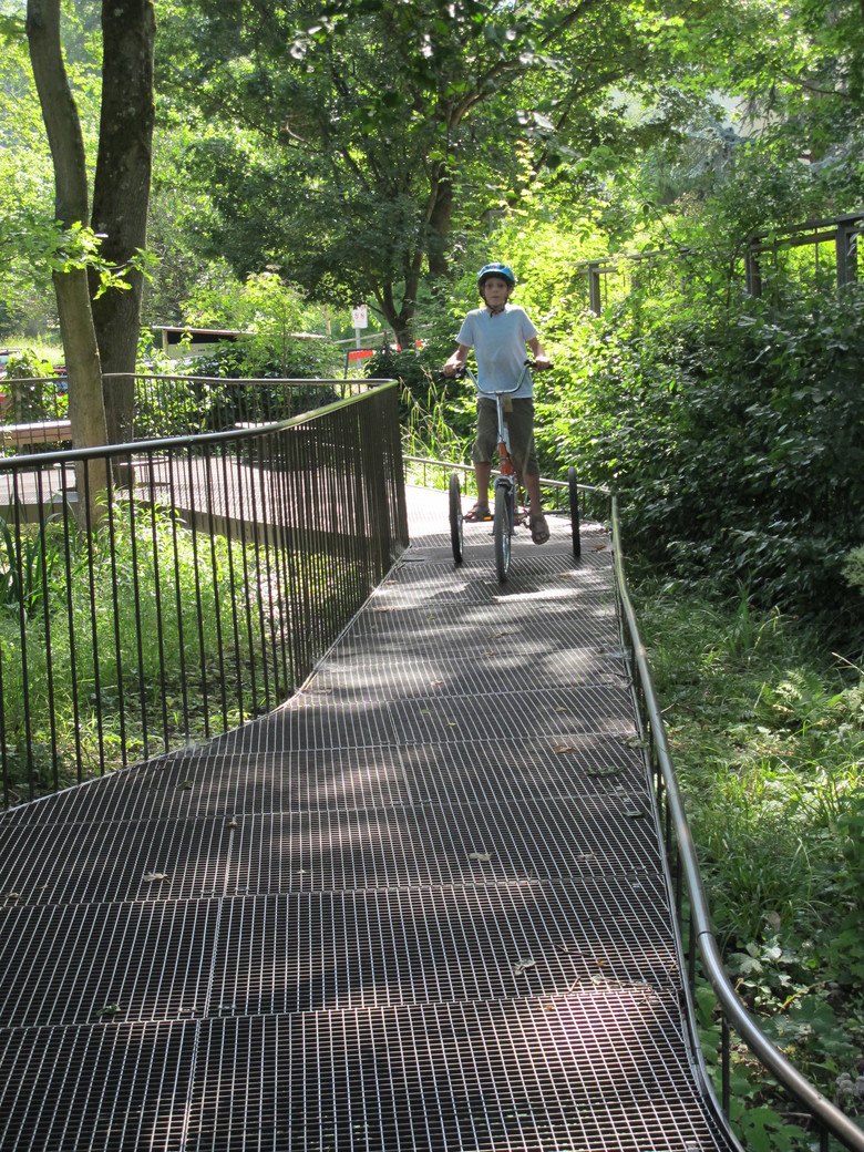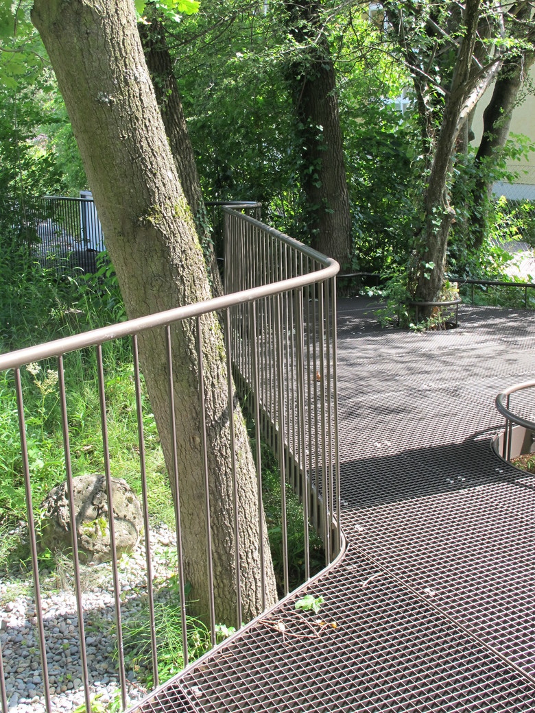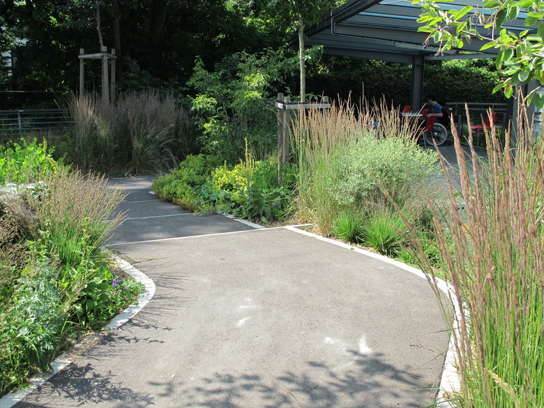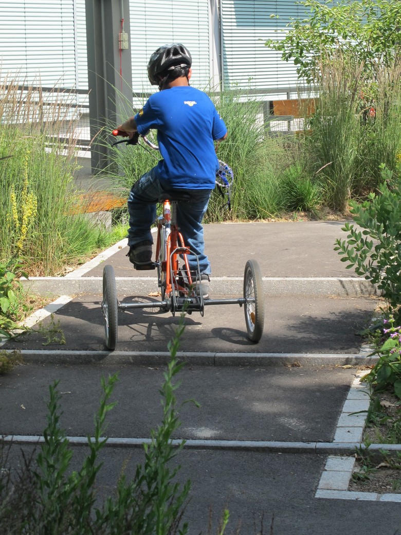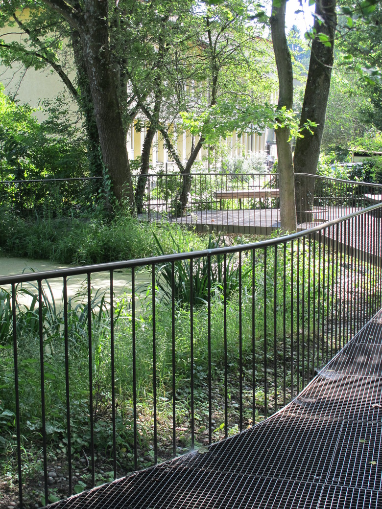 Beim Aussenbereich der SKB befinden sich Rückzugsflächen und spezifischere Angebote für die mehrheitlich an Rollstühle gebundenen Kinder. Sandspiel, der Wunsch nach einem Rollstuhlkarussell und Möglichkeiten für Rollstuhltraining gehören dazu, aber auch die früher wenig nutzbare Fläche um das Biotop herum wurde mit einer Steganlagen zugänglich gemacht.