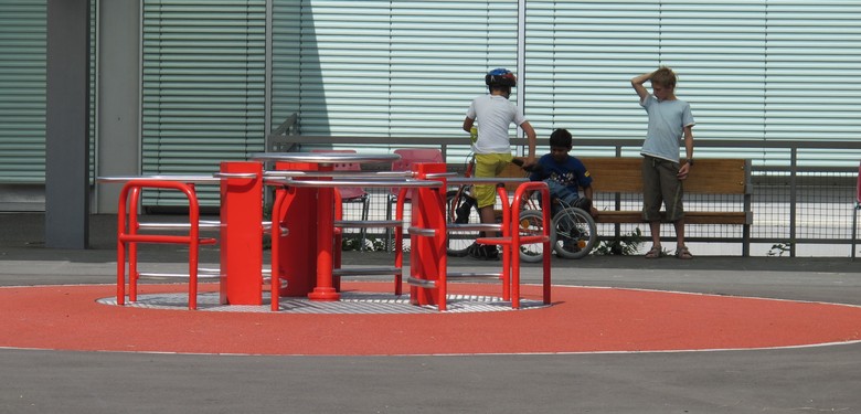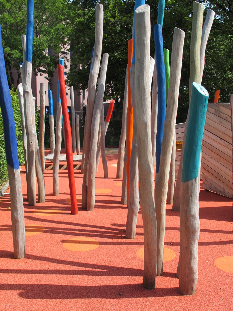 Eine der Zielsetzungen für die Umgestaltung war die Aufhebung dieser Grenze und die Schaffung eines gemeinsamen Spielbereichs für Kinder beider Schulen, ohne die Identität der unterschiedlichen Anlagen aufzugeben. An zentraler Lage wurde mit dem Integrationsspielplatz ein Ort geschaffen, wo sich behinderte und nicht behinderte Kinder im Alltag auf selbstverständliche Weise begegnen. Der Spielplatz bietet Herausforderungen für die unterschiedlichen Fähigkeiten aller Kinder. Er ist für behinderte Kinder weitgehend autonom nutzbar und dient auch therapeutischen Zwecken.