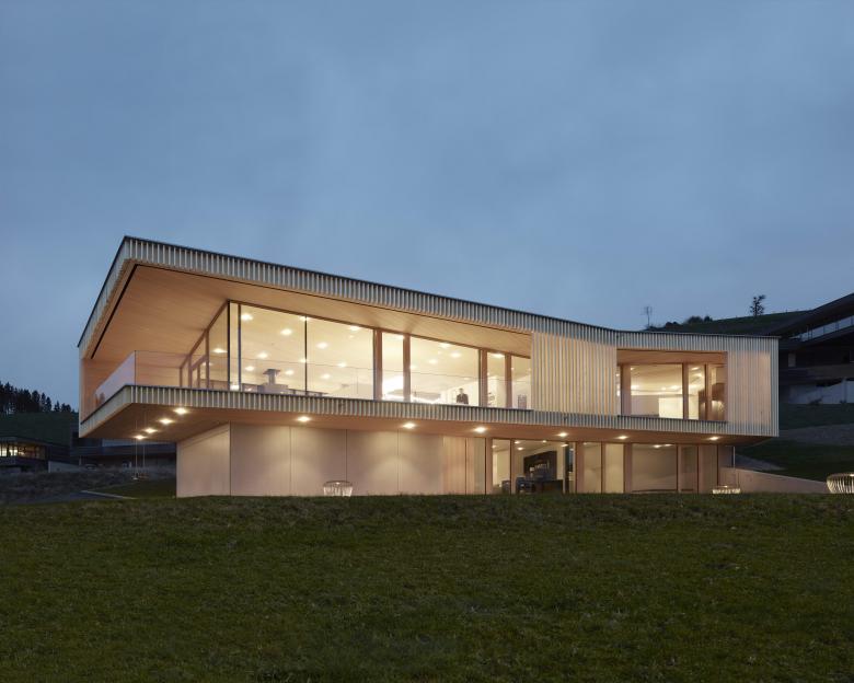 Aus der Hangneigung heraus entwickelt werden die unterschiedlichen Höhenlagen für separate Zugänge in das teilbare Gebäude genutzt. Das Haus stellt sich schützend zur bergseitigen Wetterseite und öffnet sich talwärts mit einer einladenden Geste. Das gefaltete Dach reagiert dabei auf Höhenvorgaben und fokussiert Blickachsen. Die kompakte Anordnung am Grundstück ermöglicht das Erhalten von zusammenhängenden Freiflächen.