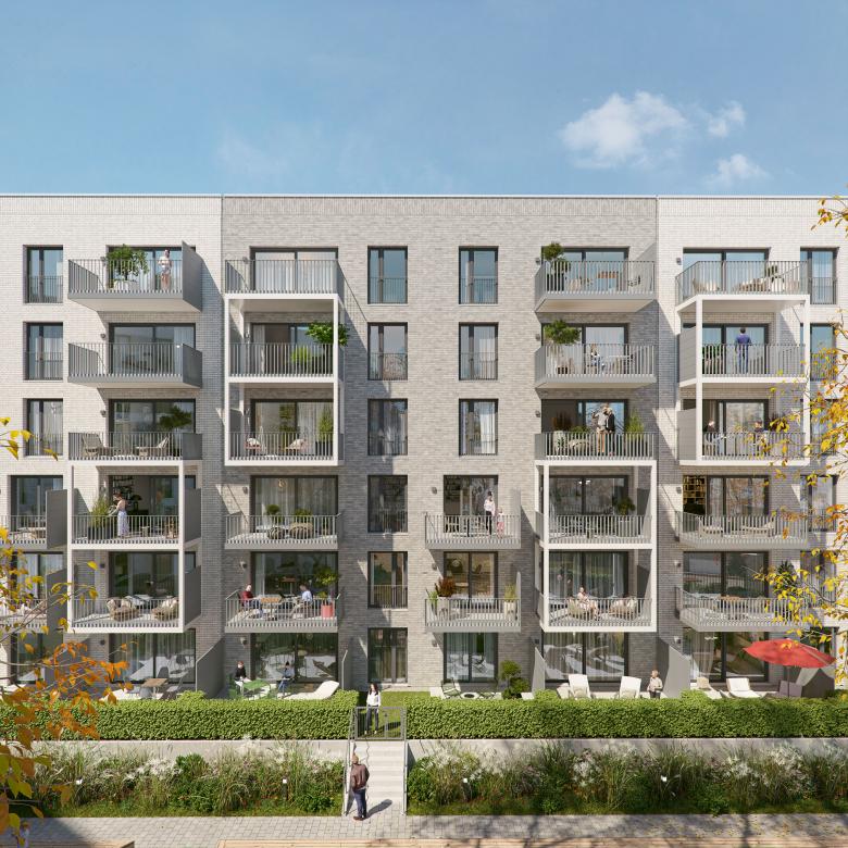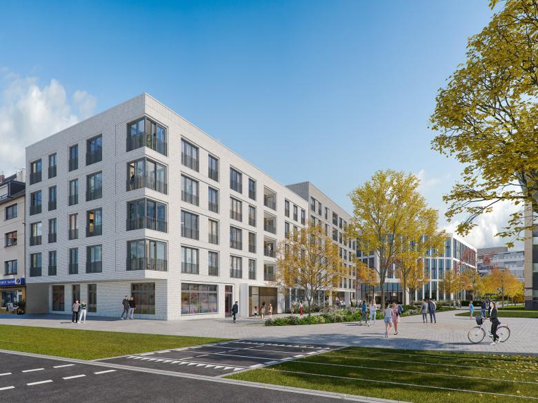 Auch für die Fassaden der Wohngebäude haben wir Wert auf langlebige, umweltverträgliche und möglichst regionale Materialien gelegt und lebendige Ansichten mit Klinker in zwei Farbtönen entworfen. Hier wird ein Quartier entwickelt, das die Vielfalt der Nachbarschaften, der Nutzungen und seiner zukünftigen Bewohner zu einem harmonischen Ganzen zusammenfügt. Die Grünräume sitzen als Kitt zwischen Wohnen und Arbeiten, aber auch zwischen Alt und Neu. Spiel und Aufenthaltsflächen, Reihen aus alten und neu gepflanzten Bäumen, Kommunikationsinseln und Straßencafés zeichnen schon heute ein vitales Bild dieses neuen Stückchens Düsseldorf in Unterbilk.