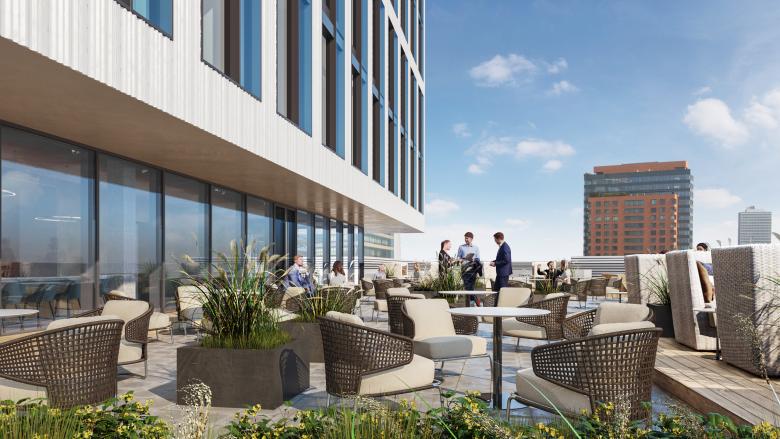 Die differenzierte Nutzungsmischung aus Büros, Wohnungen, Gastronomie sowie einer Kindertagesstätte und einem Netzwerk grüner Freiräume belebt das neue Quartier. Wir platzieren die Büros in der sechsgeschossigen langen Flanke, sowie im Kopf des an der verkehrsreichen Völklinger Straße liegenden größeren Blocks, dem OFFICEHOME Rise. Das 17-geschossige Bürohochhaus, das sich über eine eingerückte, verglaste Fuge, das sogenannte Bikini-Geschoss, aus der Mantelbebauung erhebt, bildet mit seinem grünen Dachgarten einen außergewöhnlichen Hochpunkt und setzt neben das die Straße überspannende Stadttor ein prägnantes Zeichen für den Standort. Zu Füßen des Hochhauses befinden sich eine großzügig dimensionierte Eingangshalle, angrenzend ein Konferenzzentrum und ein Restaurant. Die Fassade der Bürogebäude ist mit profilierten Blechprofilen verkleidet, die Verglasung ist geschosshoch, die Gliederung fasst jeweils zwei Geschosse zu eleganten stehenden Fensterfronten zusammen. Die Wohnbebauung, mit der dieser Block im Nordosten geschlossen wird, profitiert von einer Durchmischung, nicht nur bei den Wohnungsgrößen von 2 bis 5 Zimmern, sondern auch von frei finanzierten, öffentlich geförderten und preisgedämpften Angeboten. Eine besondere Qualität aller Wohnungen ist ihre geschützte Lage, die Ausrichtung auf den intensiv begrünten Innenhof zur einen Seite, auf der anderen Seite auf den Boulevard, der zum nachbarschaftlichen Miteinander einlädt.