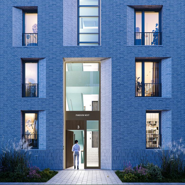 Mit dem PANDION Next wird die bestehende kleinteiligere Bebauung an der Neusser Straße fortgeführt, spiegelbildlich zum westlichen Bereich liegen auch hier entlang des grünen Boulevards verschiede Wohnungstypen, auf dieser Seite jedoch ausschließlich frei finanzierte. Die Kita, die auch aus den angrenzenden Wohnvierteln gut zu erschließen ist, nutzt als Außenspielfläche Bereiche des grünen Innenhofes.