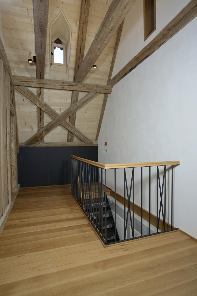 Die Unterbringung der Gastroküche, Technik- und Lagerräume erfolgte im neuen Anbau, welcher sich formal zurückhaltendend an den historischen Bestand angliedert. Die Verbindung zwischen alt und neue erfolgte mit bewusst gesetzten Öffnungen, wo vorhanden wurden bestehende Öffnungen genutzt. Die Verbesserung der Belichtung im Dachgeschoss erfolgte mit subtilen Interventionen unter den Krüppelwalmen und rückseitig angeordneten, zurückhaltend gestalteten Dachaufbauten.