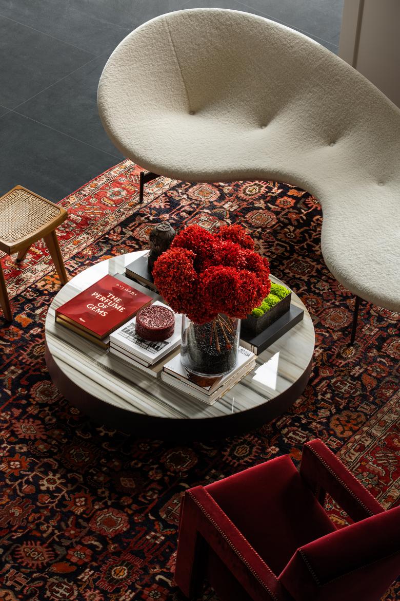 The floral art and greenery are strikingly red and lush, adding a touch of brightness to the elegant space. It enriches the space while creating a unique life force.