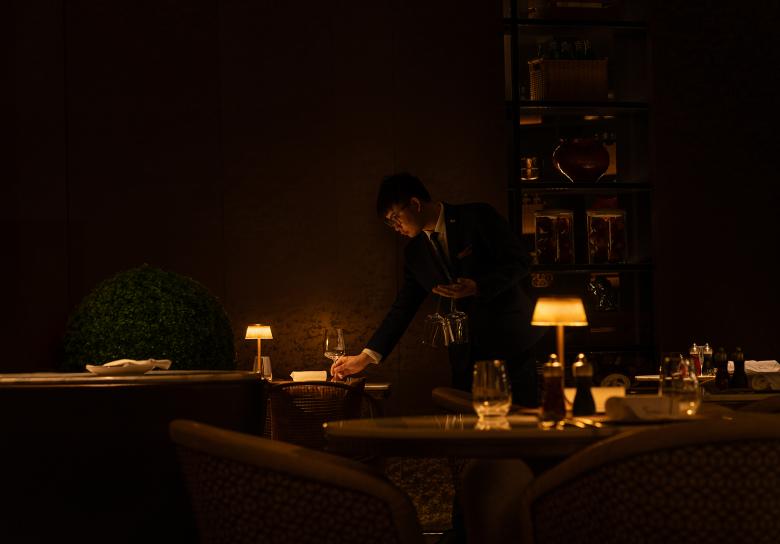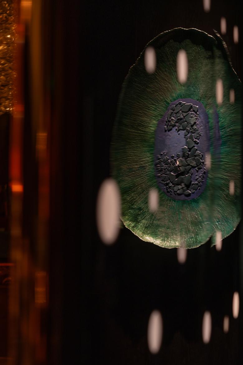 A dark stainless steel ceiling descends like an ink-black night sky, where ripple-textured glass spheres hover delicately, like dew crystallized in mist. When the 360° rotating spotlights ignite, firefly-like glimmers trace fluid trajectories across the walls, animating the space with motion and mystery.
