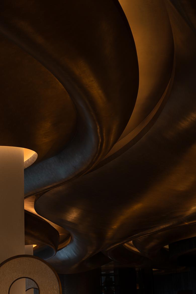 As twilight descends, Fiamma glows like amber embedded in the city’s fabric. With gentle, organic gestures, spatial textures softly unravel, transforming architecture into flowing poetry. Curved lines gently delineate the flooring, enhancing a sense of fluidity, while the undulating ceiling evokes the tender imprint of tides kissing the shore, inviting quiet immersion.