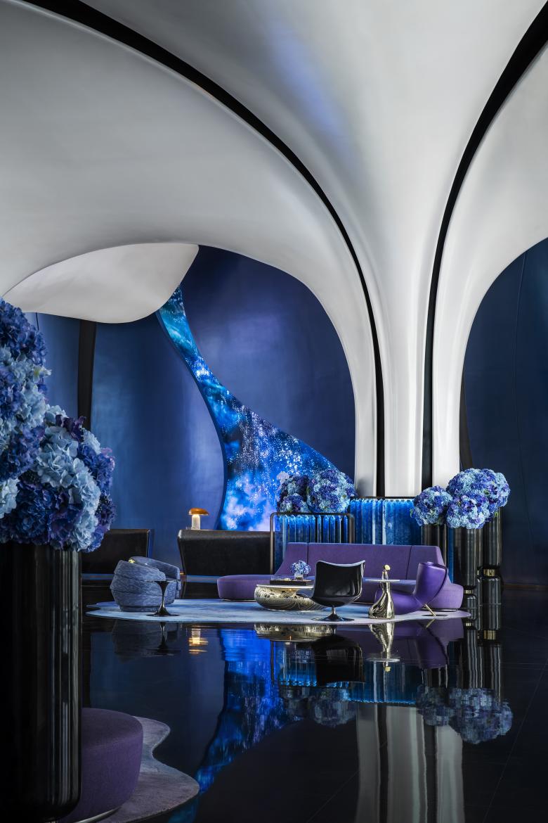 Starry blue and luminous violet set the tone, evoking a serene seascape beneath a starlit sky. In subtle interplay with soft white accents, the curated palette soothes the restless souls of the city. Curved furnishings echo the fluid rhythm of waves, infusing the interior with organic vitality.
