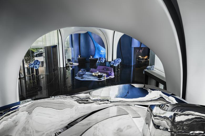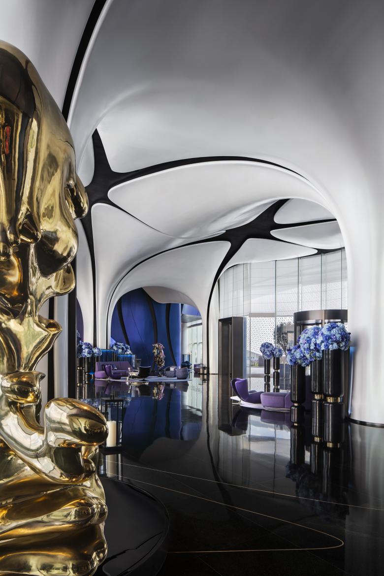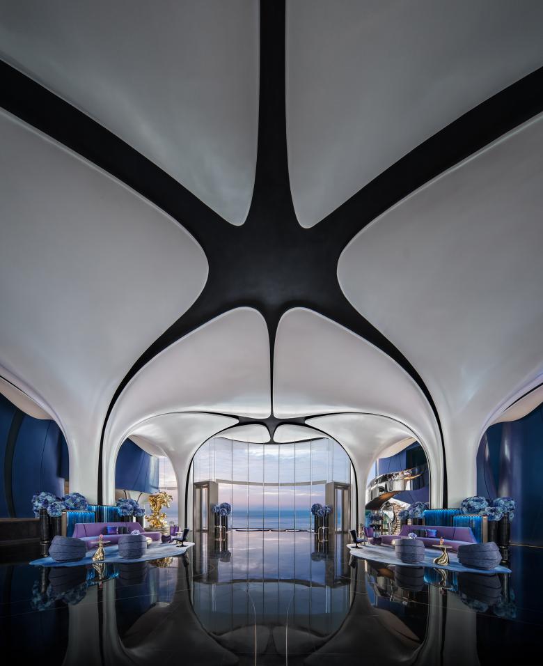 Inspired by the themes of “Sky Curtain · Sea Veil · Azure Horizon,” the lobby and lounge capture the dynamic rhythm of ocean waves, where time becomes the measure of space—fluid, expansive, and pure—immersing guests in a realm of motion and transformation.
