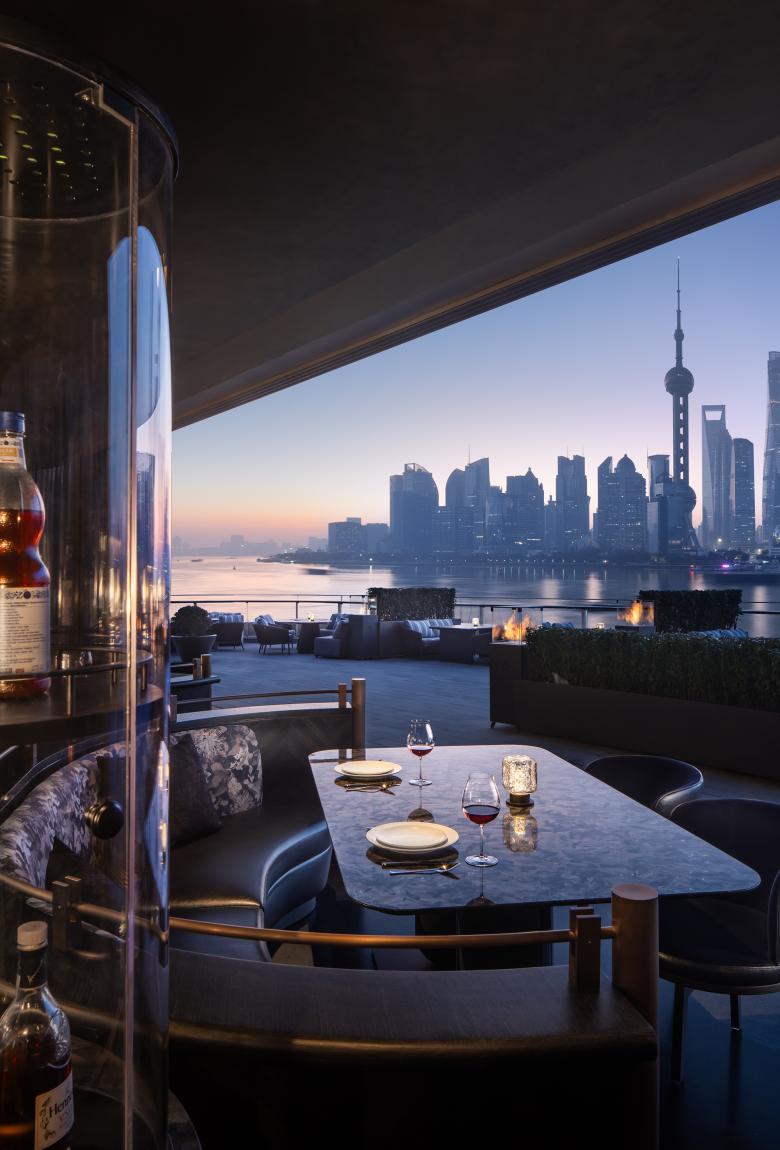 The bar features expansive windows that offer sweeping views of Shanghai's panoramic skyline, seamlessly connecting the interior and exterior, with diverse scenes unfolding at every step.
