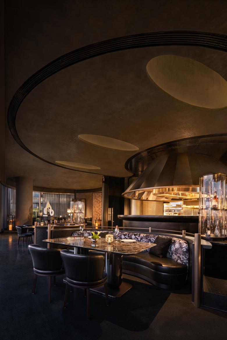 The combination of aged black metal panels and geometric shapes evokes a futuristic ambience. Simple yet comfortable furniture, along with decor with a sense of fluidity, embody the interplay between softness and rigidness, as well as the East and West.