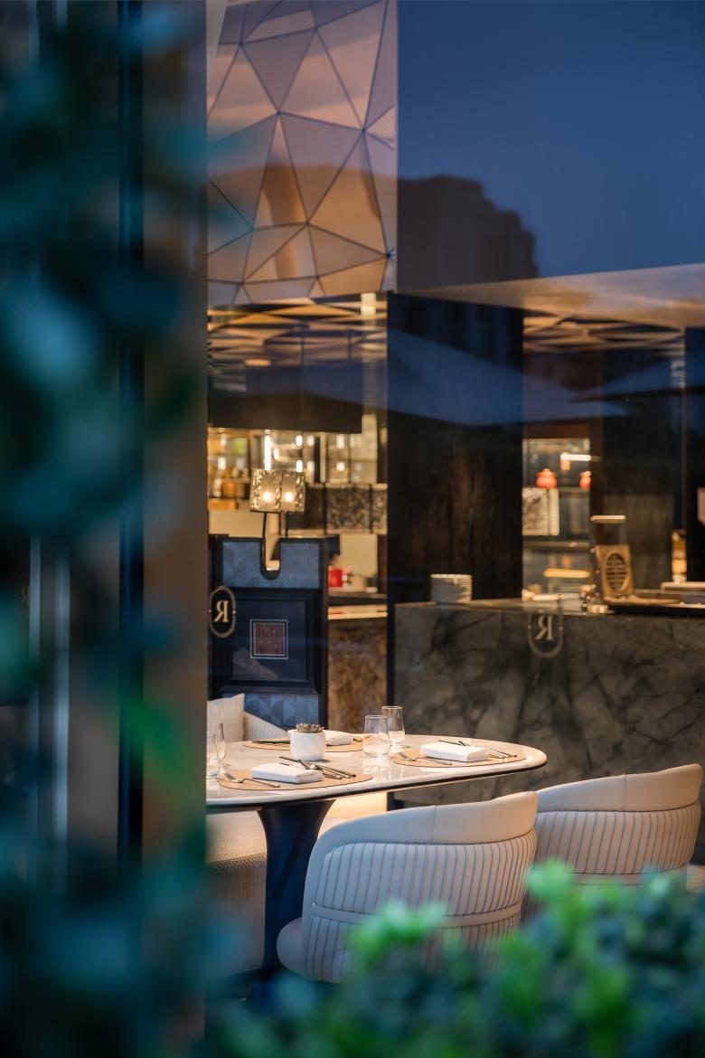 Harmonia, the hotel's all-day dining restaurant, continues the architectural language with slanted beams and window-side booths that frame sweeping views of the city skyline and river scenery, evoking a sense of grandeur.