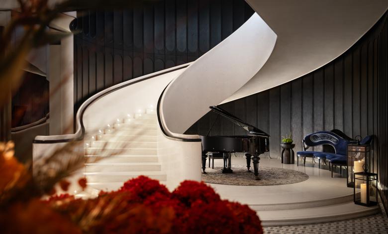 The lobby preserves iconic elements of The Seagull hotel, including a century-old piano and a spiral staircase. The white stone staircase, complemented by striped black walls and diamond-cut ceilings, spirals upwards towards the banquet hall, subtly paying homage to the old days and inviting new stories to unfold.