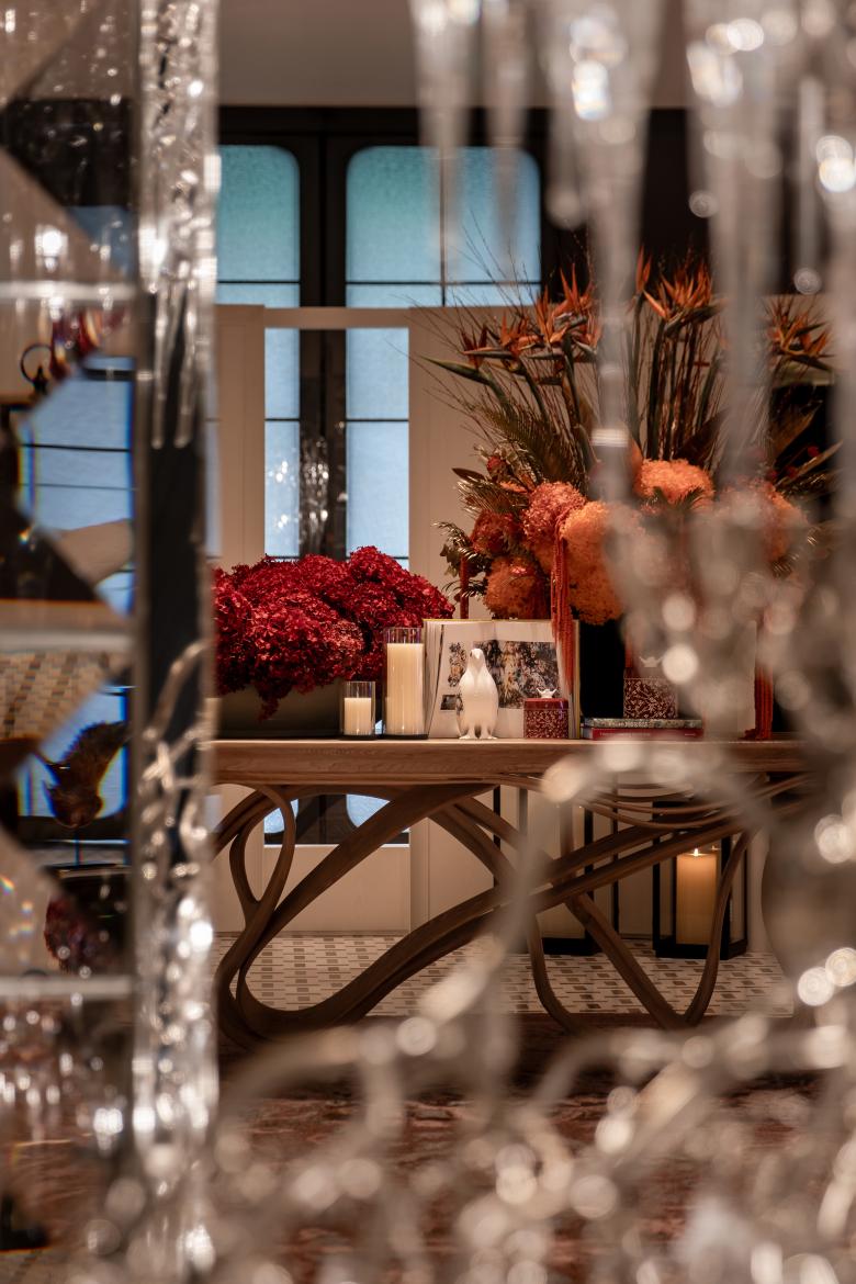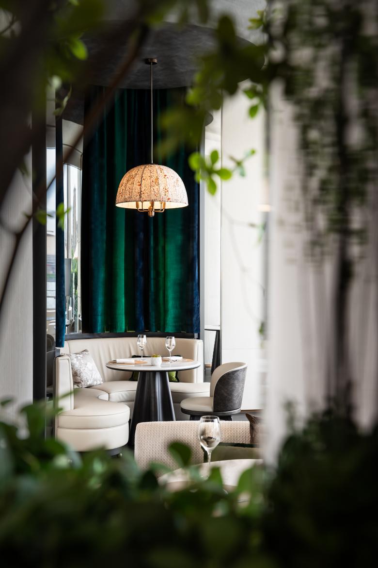 Custom-made velvet curtains in red and green gradients introduce the textures of modern Shanghai while embracing the warm philosophical essence of the East. This infusion illuminates the elegance and quiet grandeur of the Shanghai style.