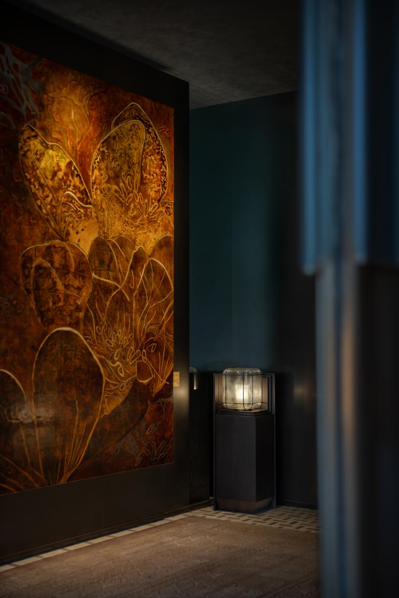 Upon entering the foyer, a striking three-meter-high lacquer painting captures the attention, crafted over six months by skilled artisans. This piece, inspired by Shanghai's city flower, the magnolia, narrates the passage of time with its weathered surface, echoing the city's rich cultural heritage.