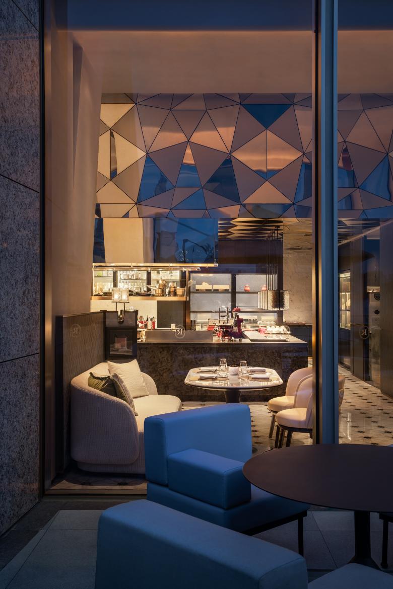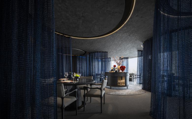 The dining area features ringed ceiling above each table and royal blue mesh curtains that form semi-open spaces, striking a delicate balance between intimacy and openness while creating an intriguing dialogue with the open kitchen.