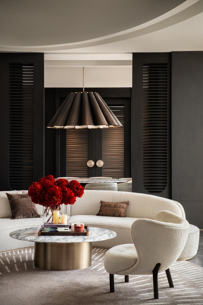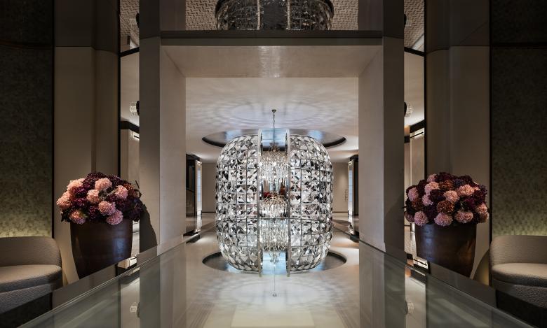 The pathway to the heart of the lobby unfolds like the gentle blossoming of a magnolia. A circular concave ceiling echoes the bud-shaped chandelier titled "Chasing Light", which features a diamond-like structure composed of geometric crystal blocks, reflecting the dance of light and shadow and the seasonal views of blossoms.