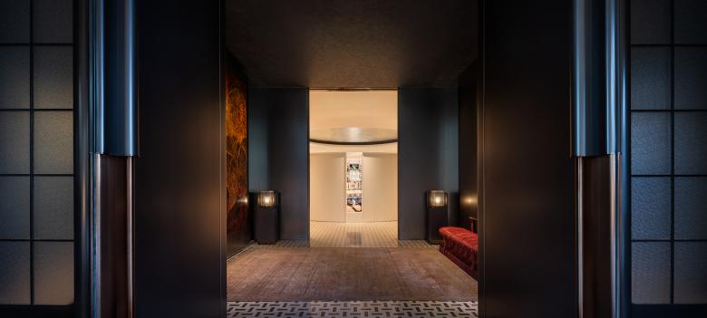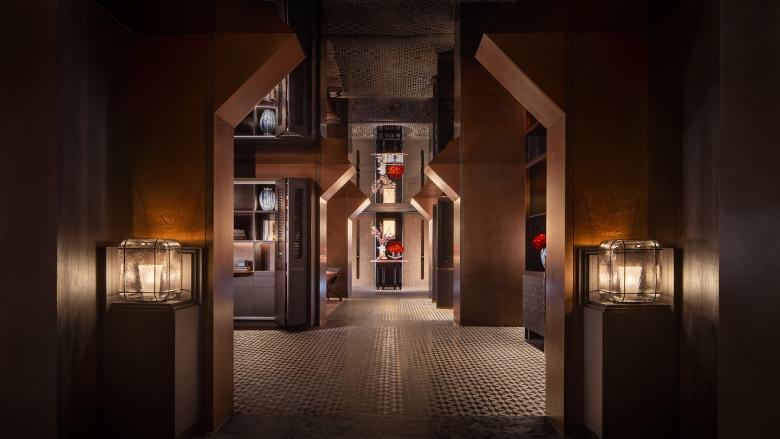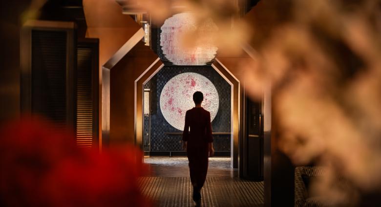 The entryway to Jin Lin— the Chinese restaurant evokes an artistic scroll painting of old Shanghai with a palette of gradient red metal and black oak, where layered partitions create a visual depth, symbolizing the passage of time and renewal.